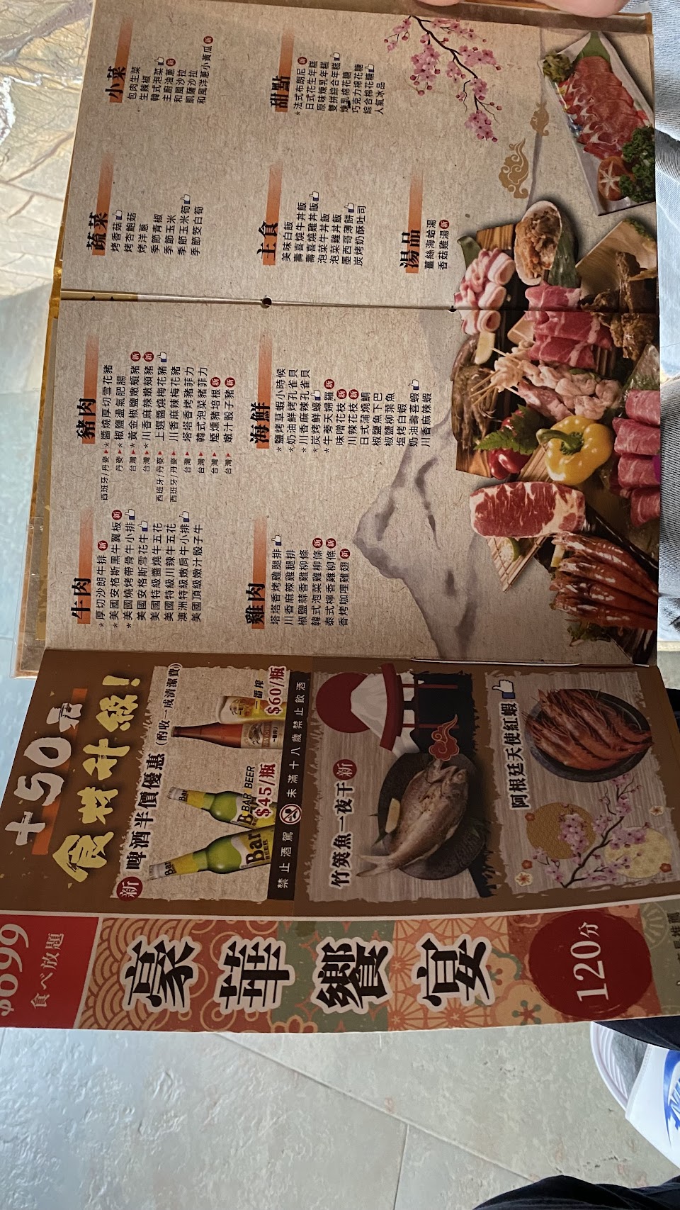 (3)用餐沒多久就問我們還很餓嗎?請我們先畫三張單壓在他們那邊算最後加點(一張單只能畫10份,全部單子都有畫2份培根豚,沒貨也不提早告知,同品項只能畫2份,份量少,有些畫了不一定會出,其中一張拿來畫甜點類),從頭到尾邊吃邊畫單還要烤很忙,加上帶位耽誤的時間,實在很難吃飽。