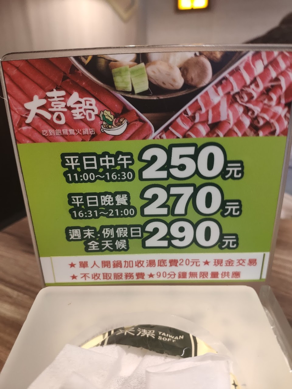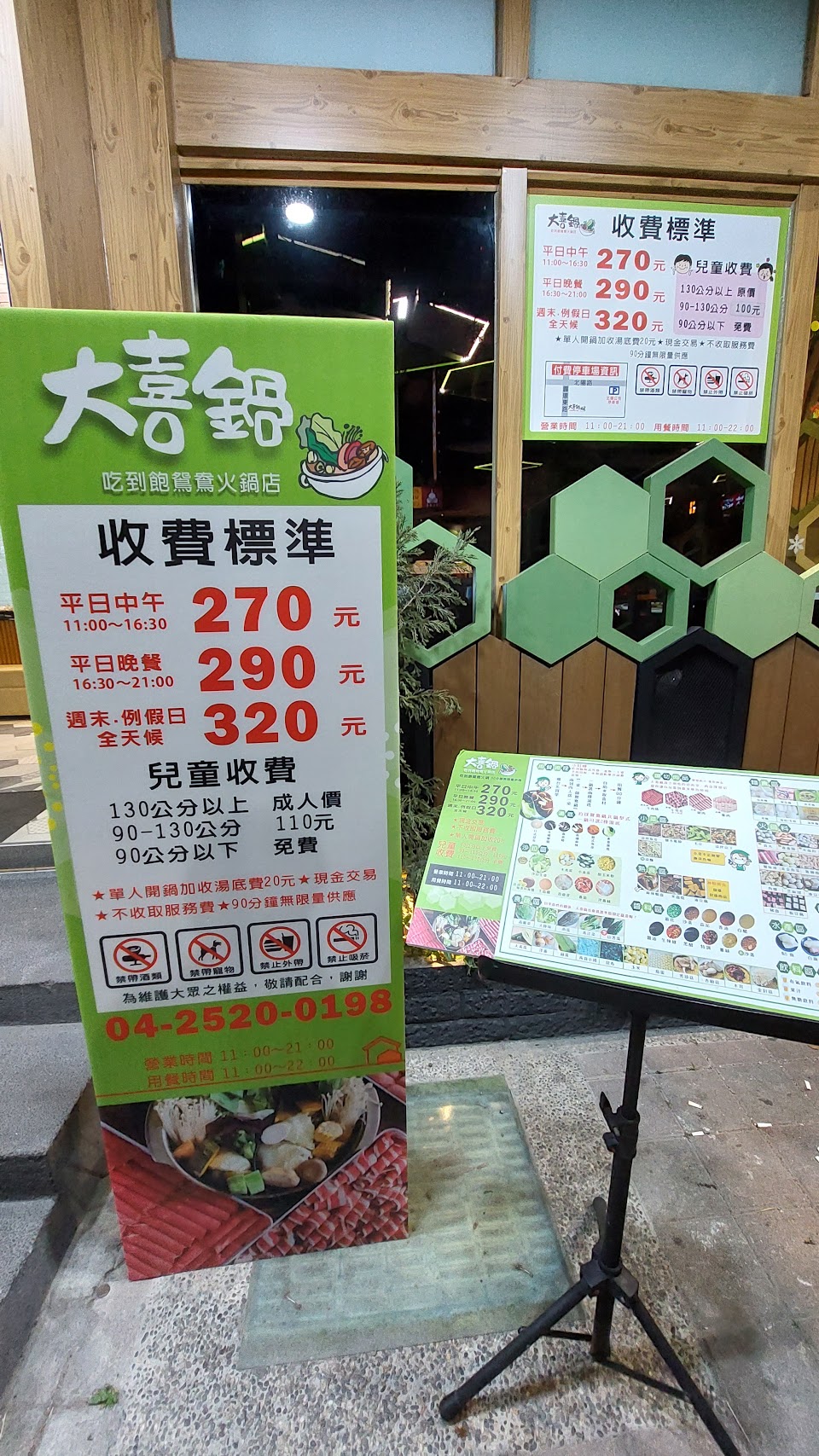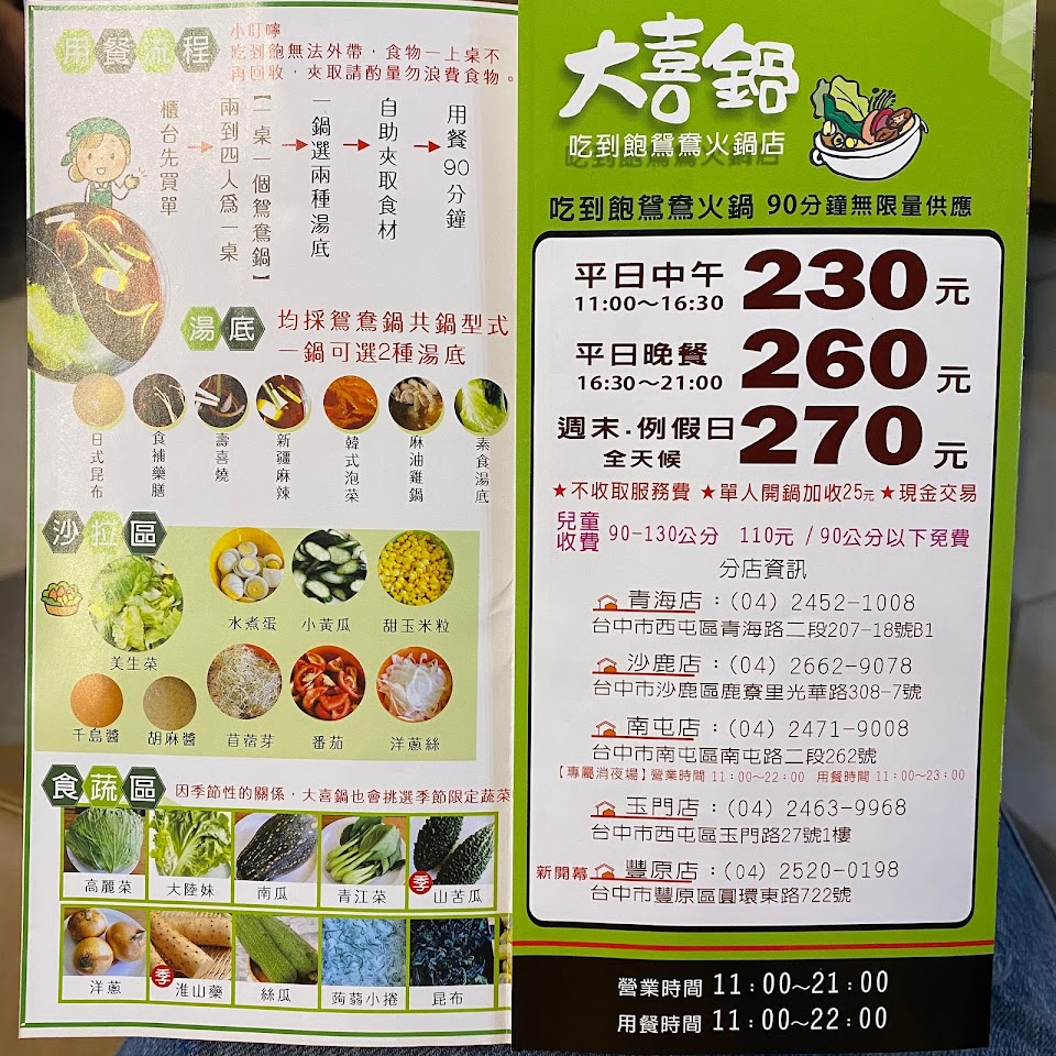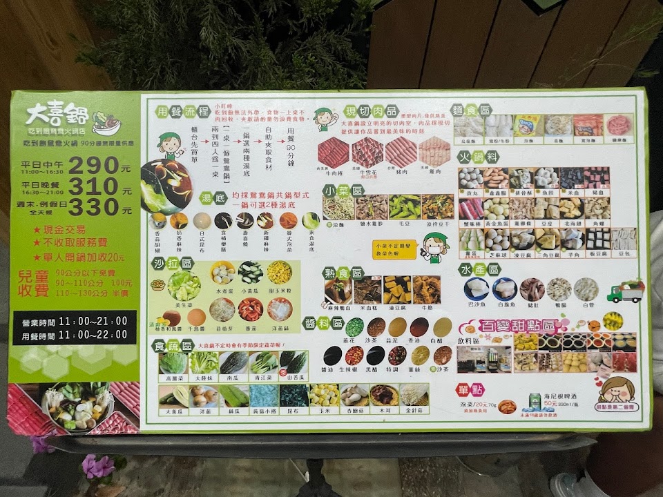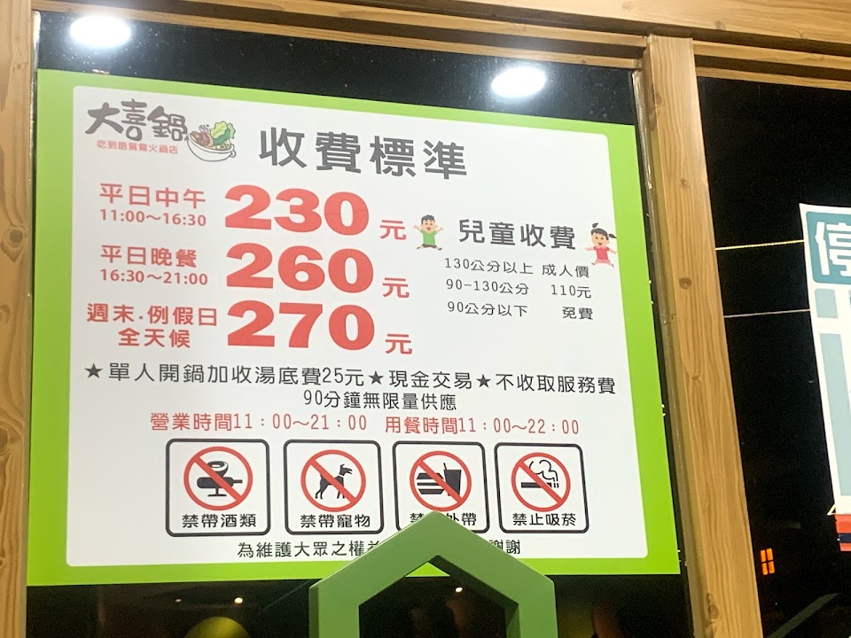 位置於台中市豐原區環中東路上,交通尚可,停車方便,環境條件尙可,生活機能好,附近商家眾多,服務貼心,沒有專屬停車場,但是往前開右轉北陽路就有一個「北陽停車塲」,1小時收費20元,今天吃不到2小時收費40元,大喜鍋很適合選擇障礙的人,用餐價格是固定,平日中午270,平日晚上290,假日320,小朋友看身高收費(圖有附身高表),超過130就是大人價格,我姪女小一吃不多,才132公分,還是收320元,店家不收服務費,用餐時間90分鐘,每鍋都是鴛鴦鍋,唯一要糾結的只有選擇湯底,共有六種,昆布,藥膳,麻辣,泡菜,壽喜燒,素食湯底,我自己吃藥膳和麻辣,說實在湯底真的很普通,麻辣不辣,藥膳沒有味道,所以你怎麼選都無所謂,真的都沒味道啦,相信我!重點是你可以吃很多很多青菜和肉吃到飽,肉品也不多就牛肉片兩種,豬肉片一種,雞柳一種,就沒了喔!玉米很甜,我很喜歡,食材本身我都覺得滿新鮮,熟食區一定要吃「滷肉飯(大推)」,還有「牛筋」也好吃不柴,沒有腥味,另外「麻辣鴨血」非常入味,比我點的麻辣湯底還辣,我都把熟食區的麻辣鴨血丟到我的麻辣鍋加味,飲料部分,每個人只有1個塑膠杯重複使用,冷飲推「冬瓜檸檬」和「烏梅汁」,熱飲推「相思紅豆奶茶」,千萬不要喝「蜜香奶茶」,難喝到讓你要懷疑人生,甜品區推「雞蛋布丁」,「小麻糬」內有包餡,蛋糕,冰淇淋就一般般,不是特別好吃但也不難吃就是,其實店家服務很好,服務生笑臉相迎都不會不耐煩,店面維持很乾淨,補東西都補的很阿莎力,不會因為假日人多就拖拖拉拉,整體來說都相當不錯,很適合去吃個粗飽!烹煮技巧熟練,口味,口感適當,是非常不錯休閒,聚會,用餐最佳好去處。