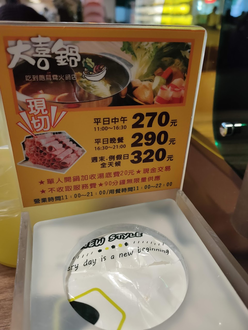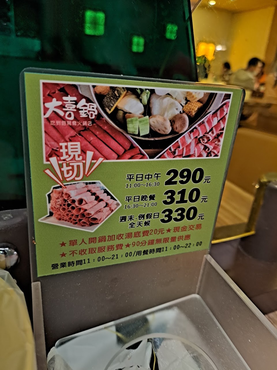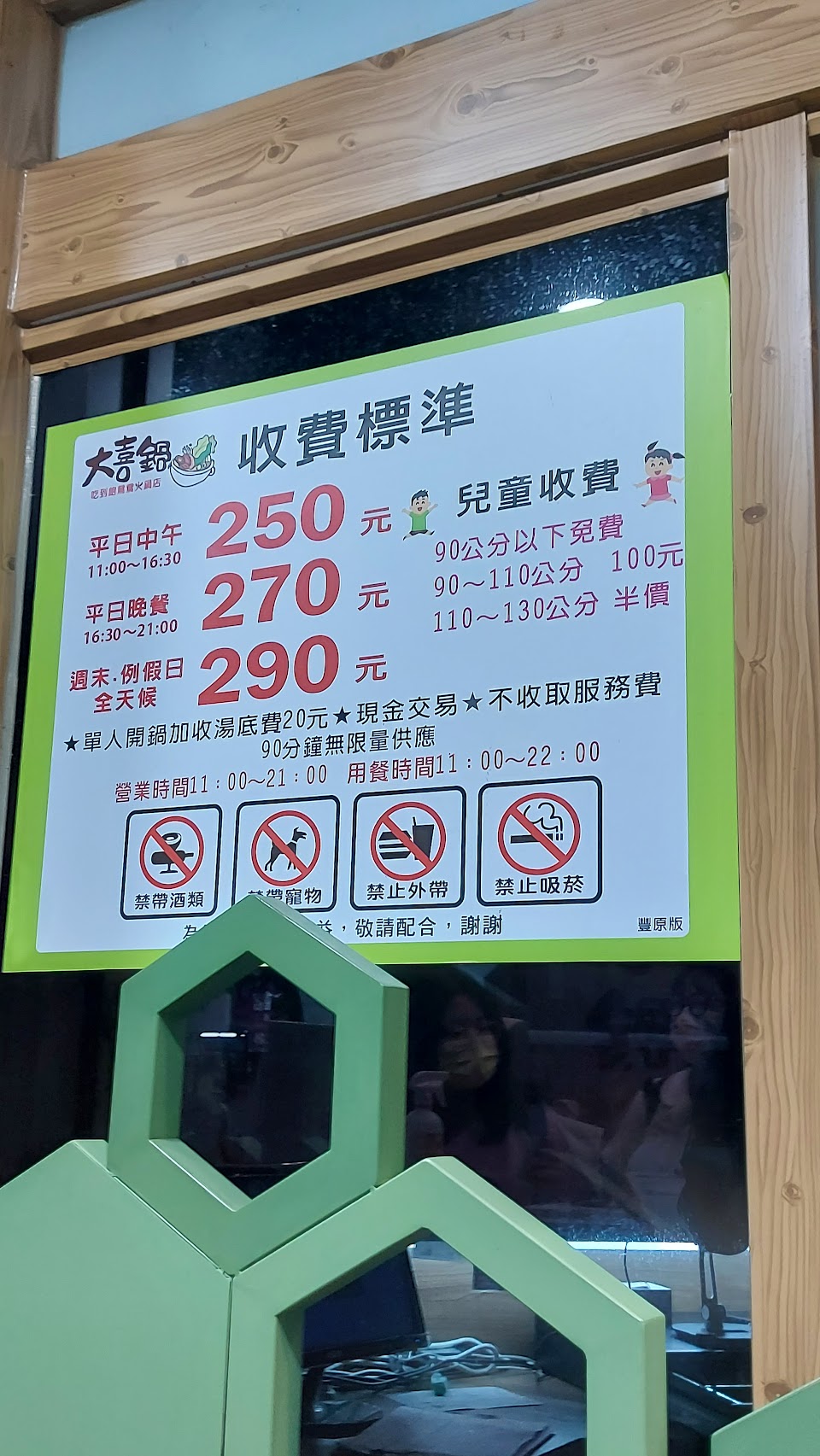 位置於台中市豐原區環中東路上,交通尚可,停車方便,環境條件尙可,生活機能好,附近商家眾多,服務貼心,沒有專屬停車場,但是往前開右轉北陽路就有一個「北陽停車塲」,1小時收費20元,今天吃不到2小時收費40元,大喜鍋很適合選擇障礙的人,用餐價格是固定,平日中午270,平日晚上290,假日320,小朋友看身高收費(圖有附身高表),超過130就是大人價格,我姪女小一吃不多,才132公分,還是收320元,店家不收服務費,用餐時間90分鐘,每鍋都是鴛鴦鍋,唯一要糾結的只有選擇湯底,共有六種,昆布,藥膳,麻辣,泡菜,壽喜燒,素食湯底,我自己吃藥膳和麻辣,說實在湯底真的很普通,麻辣不辣,藥膳沒有味道,所以你怎麼選都無所謂,真的都沒味道啦,相信我!重點是你可以吃很多很多青菜和肉吃到飽,肉品也不多就牛肉片兩種,豬肉片一種,雞柳一種,就沒了喔!玉米很甜,我很喜歡,食材本身我都覺得滿新鮮,熟食區一定要吃「滷肉飯(大推)」,還有「牛筋」也好吃不柴,沒有腥味,另外「麻辣鴨血」非常入味,比我點的麻辣湯底還辣,我都把熟食區的麻辣鴨血丟到我的麻辣鍋加味,飲料部分,每個人只有1個塑膠杯重複使用,冷飲推「冬瓜檸檬」和「烏梅汁」,熱飲推「相思紅豆奶茶」,千萬不要喝「蜜香奶茶」,難喝到讓你要懷疑人生,甜品區推「雞蛋布丁」,「小麻糬」內有包餡,蛋糕,冰淇淋就一般般,不是特別好吃但也不難吃就是,其實店家服務很好,服務生笑臉相迎都不會不耐煩,店面維持很乾淨,補東西都補的很阿莎力,不會因為假日人多就拖拖拉拉,整體來說都相當不錯,很適合去吃個粗飽!烹煮技巧熟練,口味,口感適當,是非常不錯休閒,聚會,用餐最佳好去處。