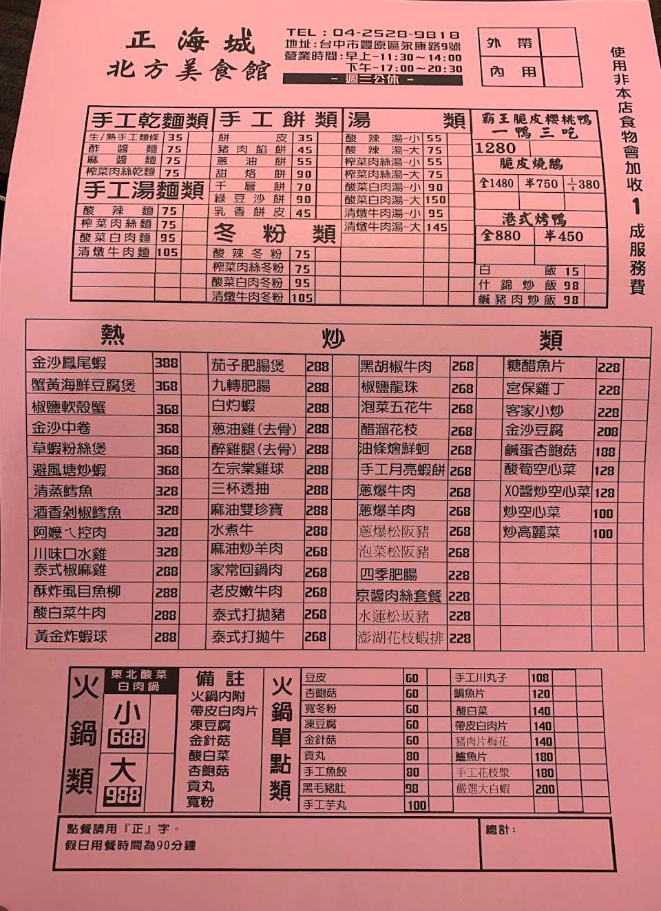在台中可以吃到印象中的台東正海城味道真的很感動!大推蔥油餅、豬肉餡餅、蔥油餅、豬肉餡餅及千層餅。感覺酸菜白肉鍋的味道有調整過,變得比剛開店時酸多了,不太能習慣。