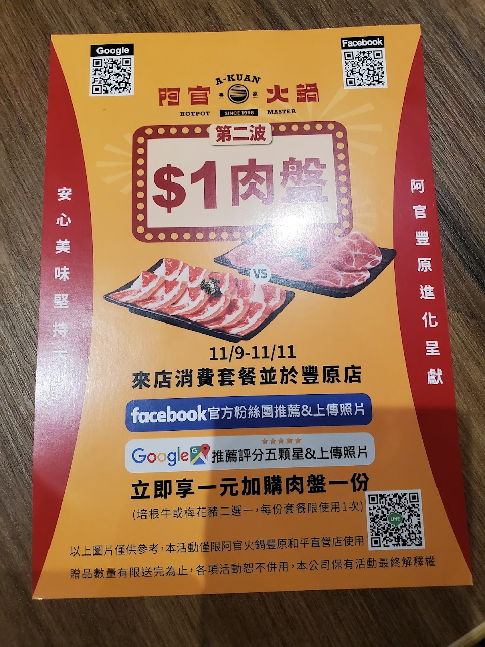 現在第二件五折 沒吃過進來結果很喜歡! 健康豬肉片超好吃 整體含菜盤很新鮮❤ ! 份量也夠! 沾醬竟然有蒜酥!搭在沙茶醬裡很特別多一個口感! 醬的部分口味不是特別重但我很愛! 有明治冰淇淋~ 桌面大很乾淨!鍋子本來就是鴛鴦鍋可以一般轉門涮肉很棒! 會想再來!