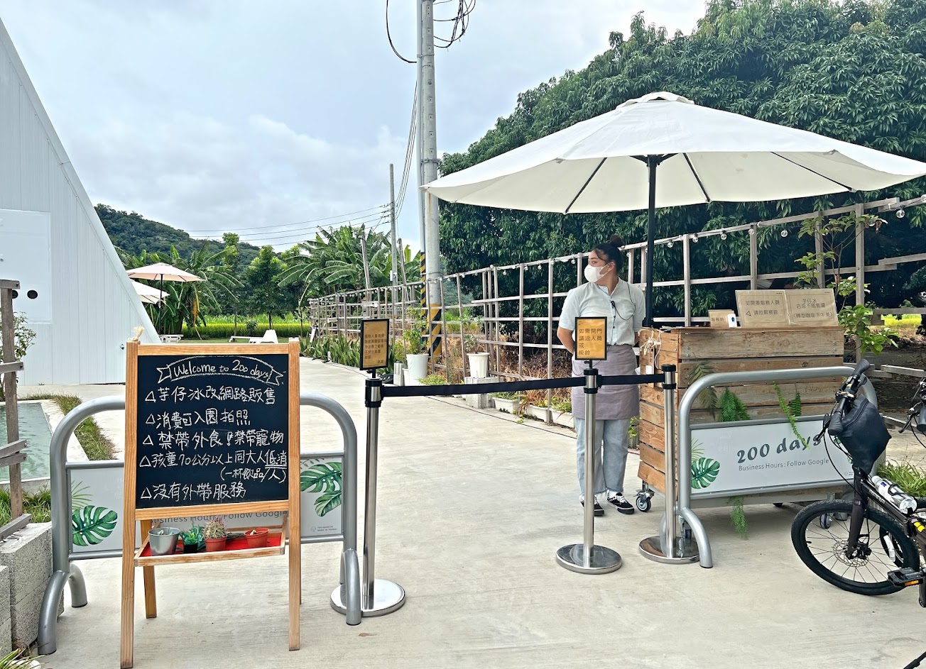 200days在東豐綠廊1.1km處,純白色建築很好辨識,騎自行車經過可進來休息吃個下午茶在出發,提醒專程要來吃芋仔的,目前芋仔冰已改網路販售,低消是一人一杯飲料,餐點不含低消,假日來建議先訂位,裡面的位子不多