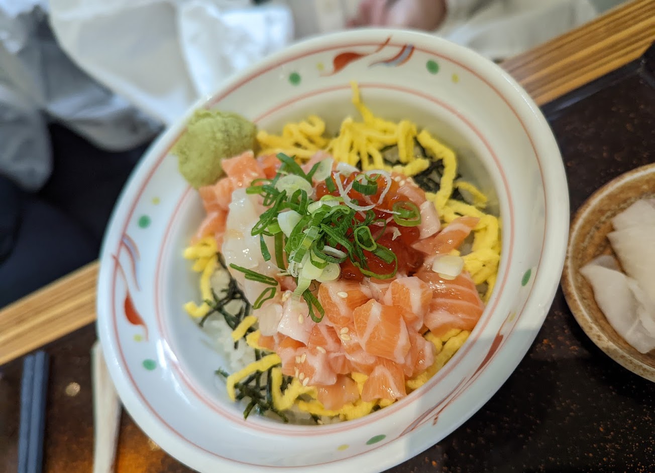 豬排飯美味、份量十足,肉滿厚的,雞蛋蓬鬆軟嫩,不會過於重口的鹹甜醬汁,風味細緻,同時可以享受大口吃肉、大口扒飯的喜悅。加點的鮭魚生魚片也新鮮肥嫩,很美味。
