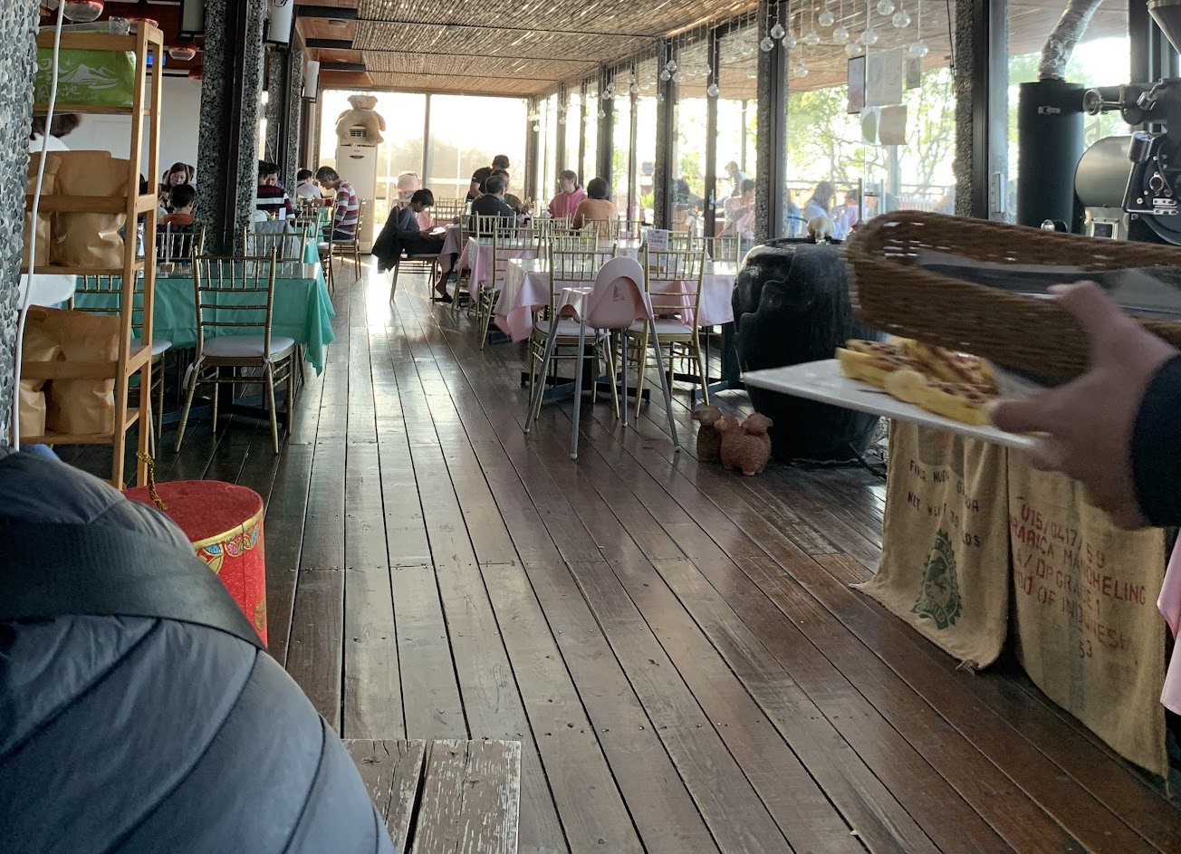 把人當成盤子的景觀餐廳,假日浪費時間的好去處,二樓餐廳估狗五星好評送一球冰淇淋?但送的冰淇淋口感粉粉的劣質很難吃、難得吃到如此不好吃的冰淇淋????但一顆星的主要理由是下面敘述不愉快的用餐體驗! 這邊環境還不錯但假日生意太好了工讀生們服務流程有很大改善空間,我們點餐結帳後到座位等待餐點,結果隔壁桌氣炸了對工讀生大聲說他們一個小時前點的鬆餅到現在都沒有送上來(他們其他餐點已經吃完了)結果工讀生才發現根本沒做他們的鬆餅?要不是他們主動問恐怕還要再繼續枯等==,於是我也走去吧台詢問,果然也沒有收到我們的點餐(吧台跟點餐是不同位子)?想說等了半小時以上鬆餅沒做好怎麼連飲料也沒有送上來⋯⋯後來大概又等了一陣子奶茶才送上來,結果又過了十幾分鐘看到鬆餅被端到吧檯桌上卻遲遲沒有送餐,只好再走過去詢問結果吧檯大姐就請我自己端過去???說他們外場服務生現在沒空,(聽到他們對話說在忙等一下有訂位的客人要過來了)雖然大姐態度和善但還是讓人覺得傻眼,畢竟有收一成服務費欸我現在要一直問上餐的進度甚至還要自己幫自己送餐,而且除了上面服務流程的問題之外,送上來的巧克力香蕉鬆餅已經冷掉了放好一陣子了硬硬的很難吃,一份還要快兩百元,總而言之下次不會再回訪,以上提供大家參考嘍。