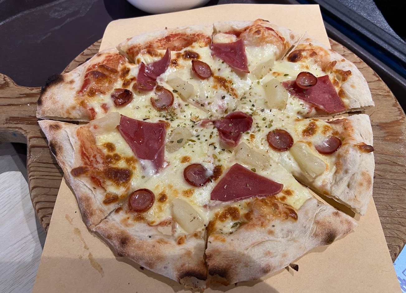 夏威夷披薩($270)不油膩,餅皮Q彈有碳香味,鳳梨微酸甜配鹹香的培根香腸很搭,比外面的窯烤披薩好吃
