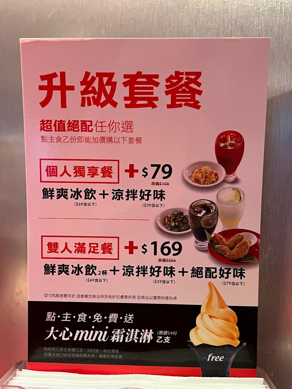 有室內與外部共用餐區分開,多了點隱私與靜謐感,湯頭是大心一貫的招牌酸辣不變,特愛套餐加點的冰淇淋,除了比單賣價格少了不知只一半外,濃郁的芝麻口味把嘴裡的酸辣味重新調和,每次來都必點