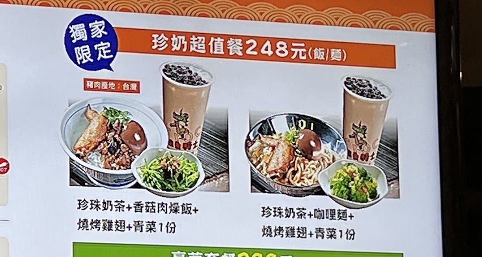 今天點珍奶超值餐$248,有咖哩麵+1支雞翅+1顆滷蛋+1盤大陸妹+1杯珍珠奶茶。