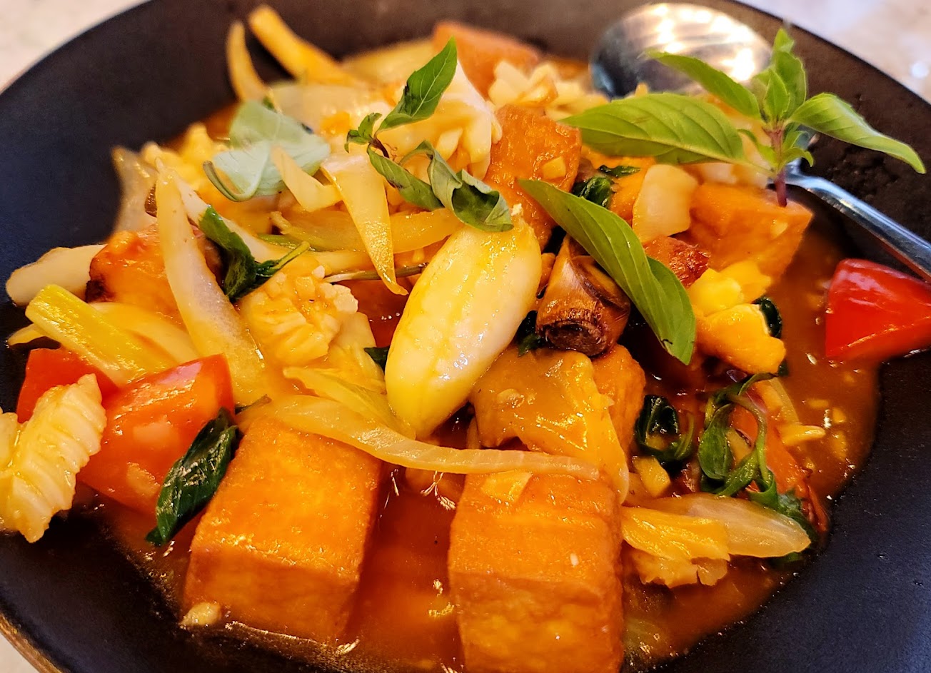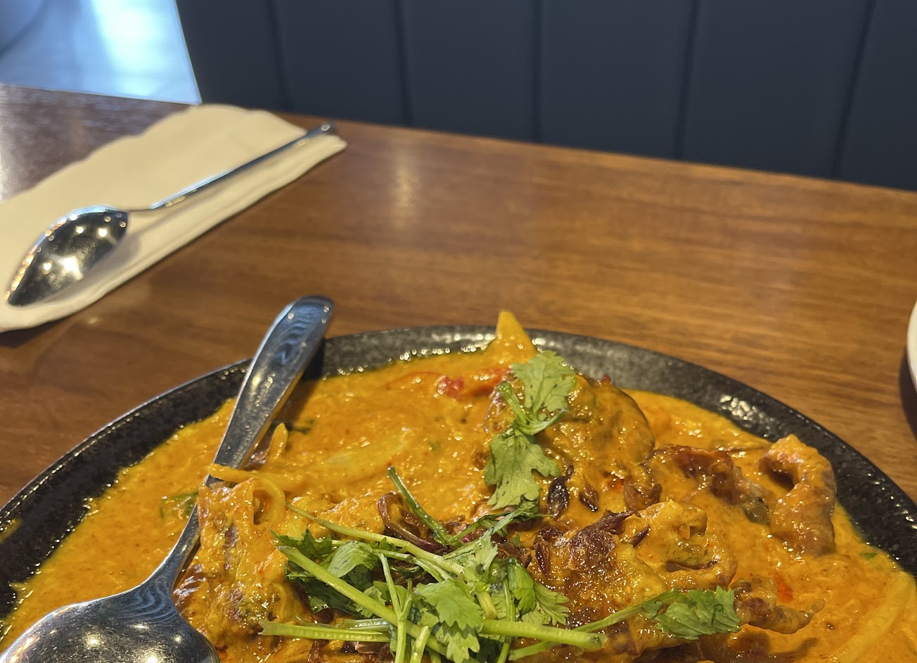 忘記拍照了。這幾天吃了兩次,服務生很讚也很親切。尤其打拋豬和咖喱軟殼蟹很下飯,小辣味道很剛好、月亮蝦餅很厚,吃起來口感紮實會飽、酸辣排骨湯比外表喝起來還爽口、摩摩渣渣超好喝,只是椒麻雞似乎有點柴,但服務親切大過一切,讚的。