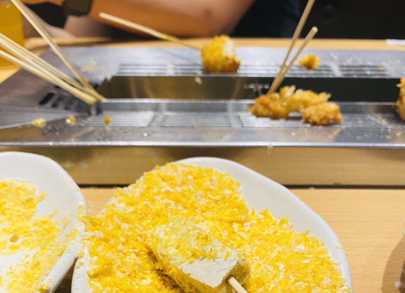 整體來說,自己炸算是很新奇的方式, 但是串炸材料真心覺得不多,而且處理的方式相當潦草,好多東西都只是「掛」在竹籤上,對於很多消費者來說,找不到施力點再戳回去,變成沒辦法順利炸。