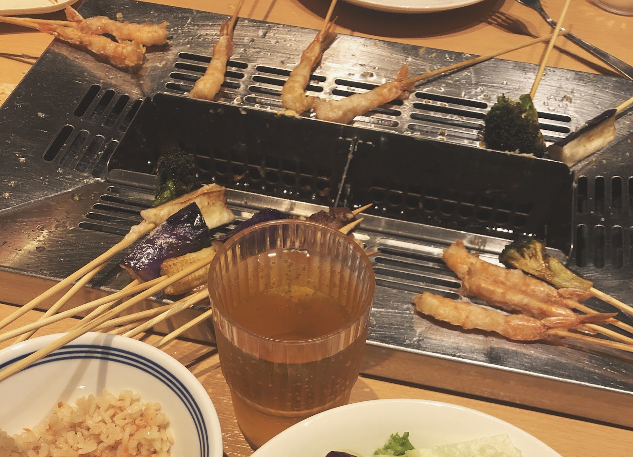 ?25種以上蔬菜、肉類、海鮮串物,會隨著季節變化,各式醬料、飲料、沙拉、甜點、冰淇淋、飯類、酒類無限供應? 串物個人覺得好吃的有:麻糬燒、玉米筍、馬鈴薯、花椰菜、雞胸肉、雞腿肉、牛肉、扇貝、鯛魚燒,份量都一小口可以每種都吃到,甜點部分有上水準之上,冰淇淋很濃郁超好吃?,很適合友人聚餐同歡,唯一缺點排煙系統沒有很好,滿滿的油煙味? …
