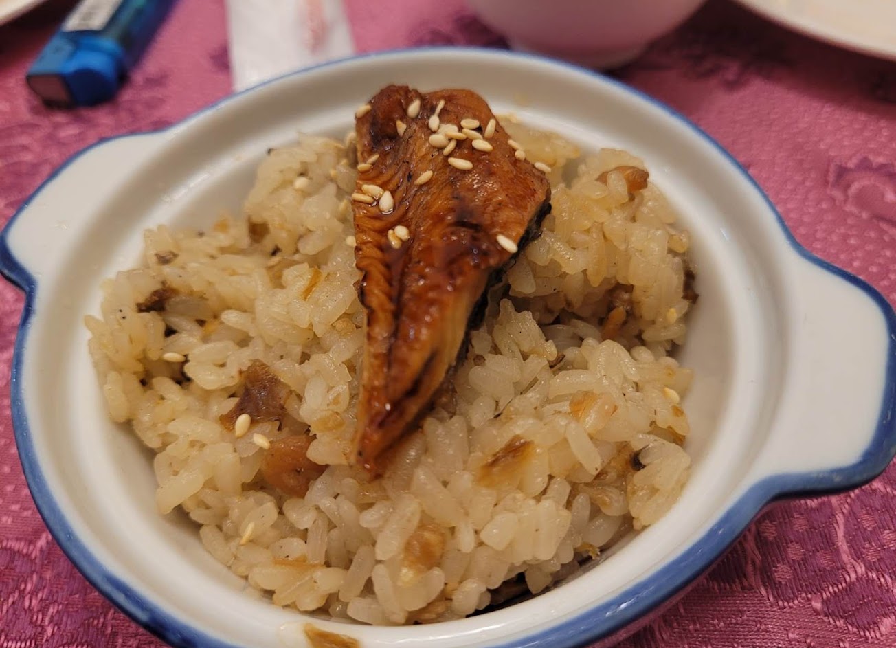 生魚片拼盤, 鰻魚油飯, 金瓜炒米粉, 炒水蓮, 蟹黃娃娃菜