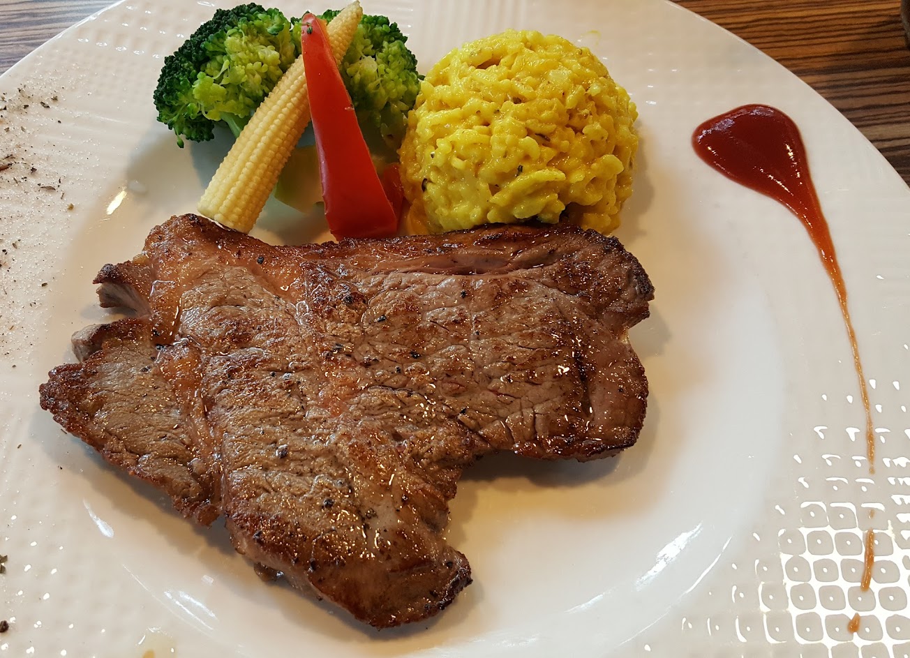 豬肋排420元,以日式醬燒代替常見的BBQ醬,烤的外酥內Q,吃起來不會有醬膩感。 戰斧豬排499元,看著夠氣派,口感也紮實。 紐約客牛排580元,肉質與口感中規中矩,但七盎司的份量對成年男性可能略嫌不夠。 沙拉,麵包,濃湯也有一定水準。 而且餐點與庭園環境,都很適合親子一起前來。