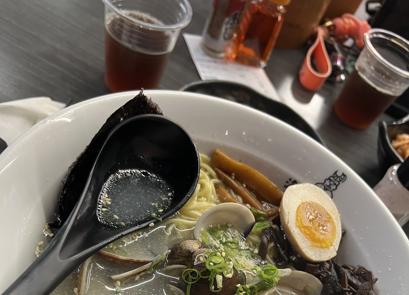 海老拉麵的湯頭特別,用料實在小菜也很好吃,小黃瓜特別爽口,店家還有提供免費的飲料,可惜晚上5點才開始營業。室內沒有座位,只有室外座位,上下班車水馬龍,空氣不太好,尤其夏天坐在外面吃拉麵會有點熱。下次可能會選擇外帶回家慢慢享用美食。針對餐點的部分還是大推~
