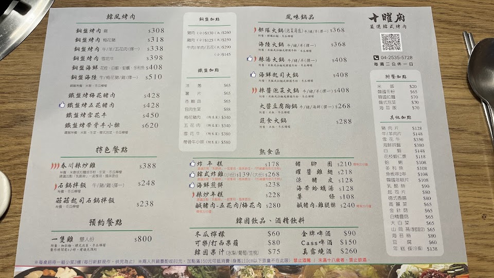 門口可停車。 銅盤烤肉梅花豬298元,再加點包肉生菜68元;還有部隊火鍋348元;海鮮煎餅208元。 附小菜五碟,可免費續。 還有冷飲冬瓜檸檬。 店家看到小朋友,主動提供額外冷飲,很親切。 五個人這樣點,已經吃到很飽了? 廁所要注意看指標,轉彎三次,易迷路?
