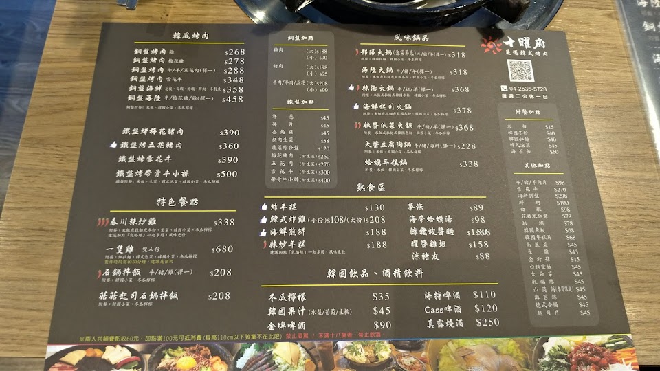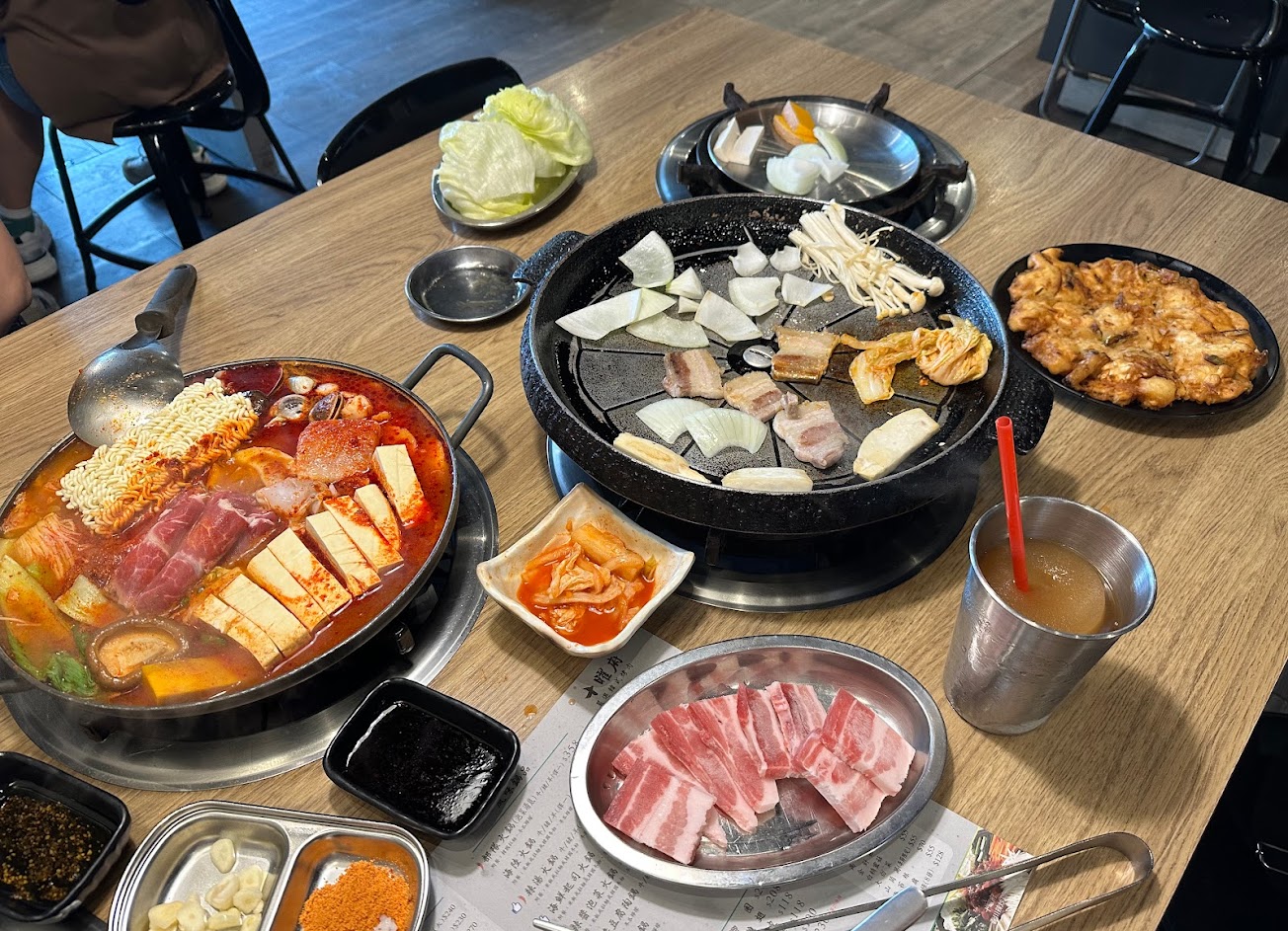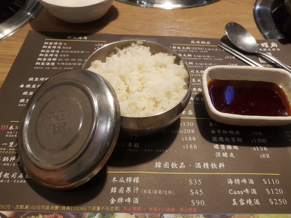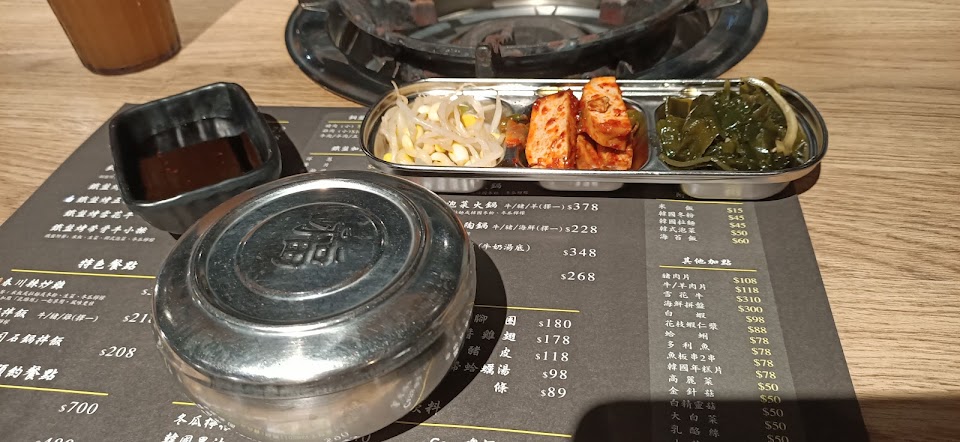 店內提供各式韓式烤肉、特色料理和鍋物,但排煙設備有點差,一進門以為失火了?整間煙霧瀰漫,友人一度想要取消預約。餐點口味還可以,銅盤烤肉給的不是火鍋的薄肉片,大塊的肉加上韓式醬料調味吃起來很過癮,配菜有蛤蜊、年糕和蔬菜。點餐前看到隔壁桌的海鮮起司火鍋好像很厲害,份量也很足,實際上餐的速度有點慢,蛤蜊和蝦子算新鮮,其他海鮮應該都是冷凍的,配菜有豆腐、年糕和蔬菜,但是香菇是酸的,味道很差。點餐後店家會先上幾樣小菜和飲品,吃完可續點,口味都很好,冬瓜檸檬非常普通。