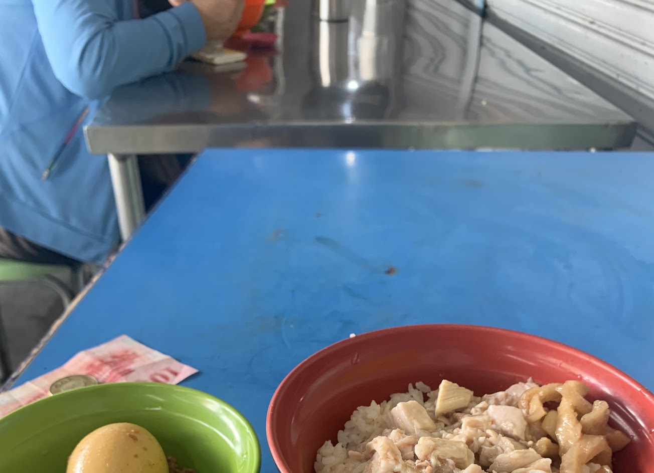 這家吃飯要早點過去不然的話什麼東西都賣完了。今天吃的是雞肉飯小碗50,因為焢肉飯也賣完了,服務人員特別強調苦瓜排骨湯星期天是不會有的,好的記住了