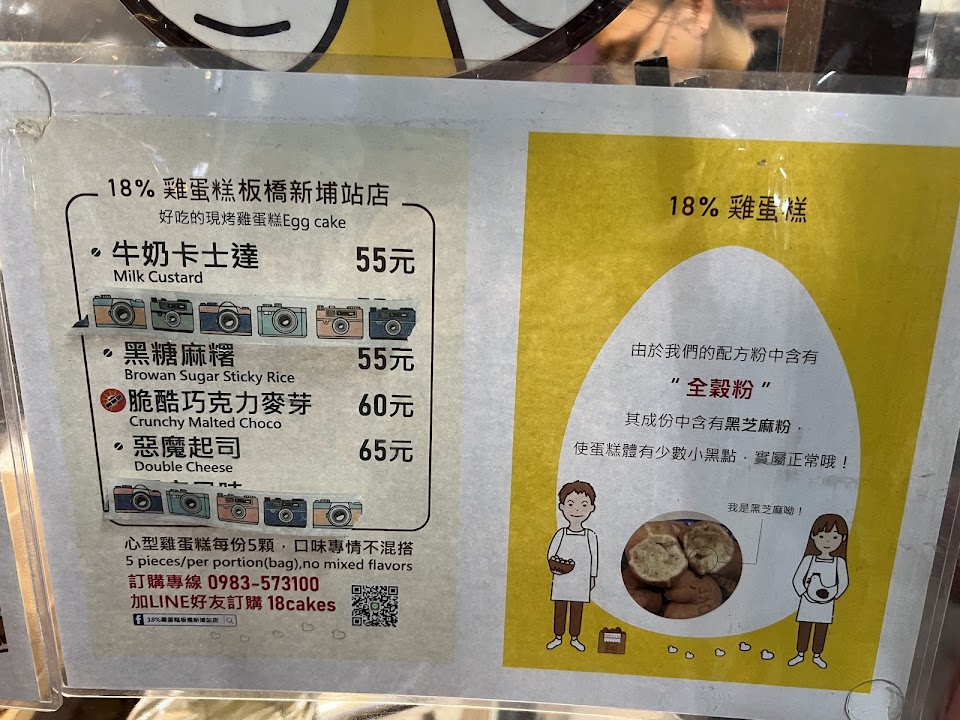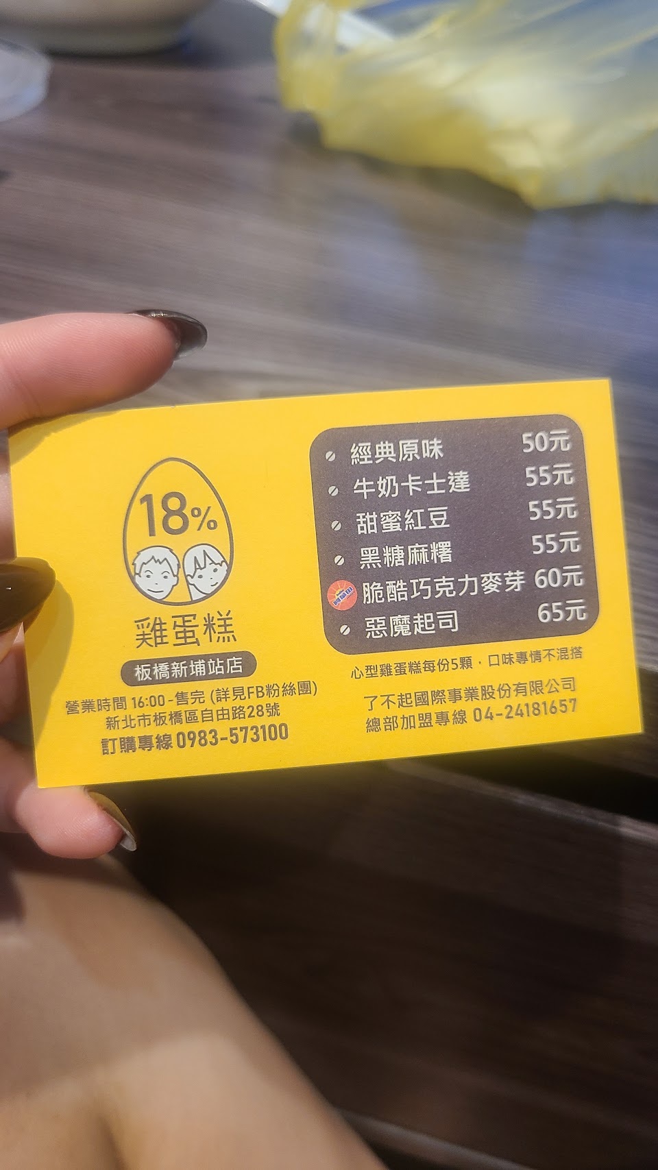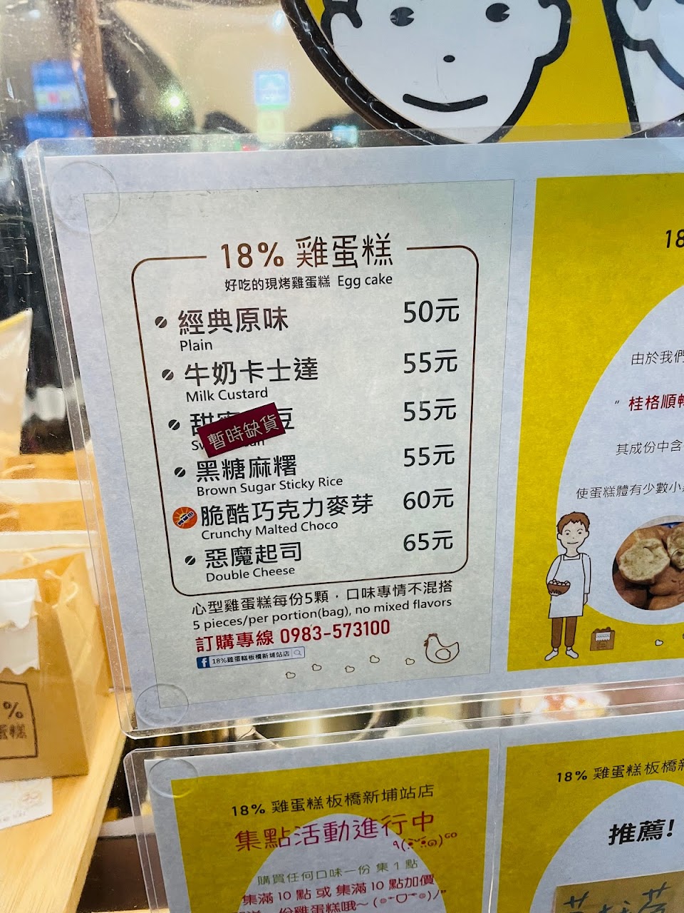 2023/02/25,外帶 買了原味$50、牛奶卡士達$55各一份 一份裡面有5個 以價格來說真的是非常高貴? 小朋友吵著想吃才會特地來買 但老闆娘的服務態度非常好 先說明會等待一段時間、再告知牛奶卡士達因為配方關係會有黑粒等等細節 到家吃雞蛋糕 也確實可以吃出真材實料 雞蛋糕的提袋非常精美 至於價格換算CP值部分 就見仁見智囉!