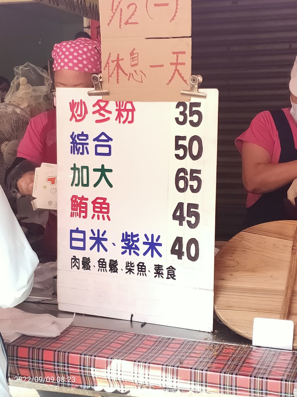 飯糰超大顆 很好吃! 炒冬粉也是份量大 滿入味的 很容易賣光 假日七點多就大排長龍 雖然老闆娘的速度很快 但是大家都買五顆以上 約等待了20分鐘