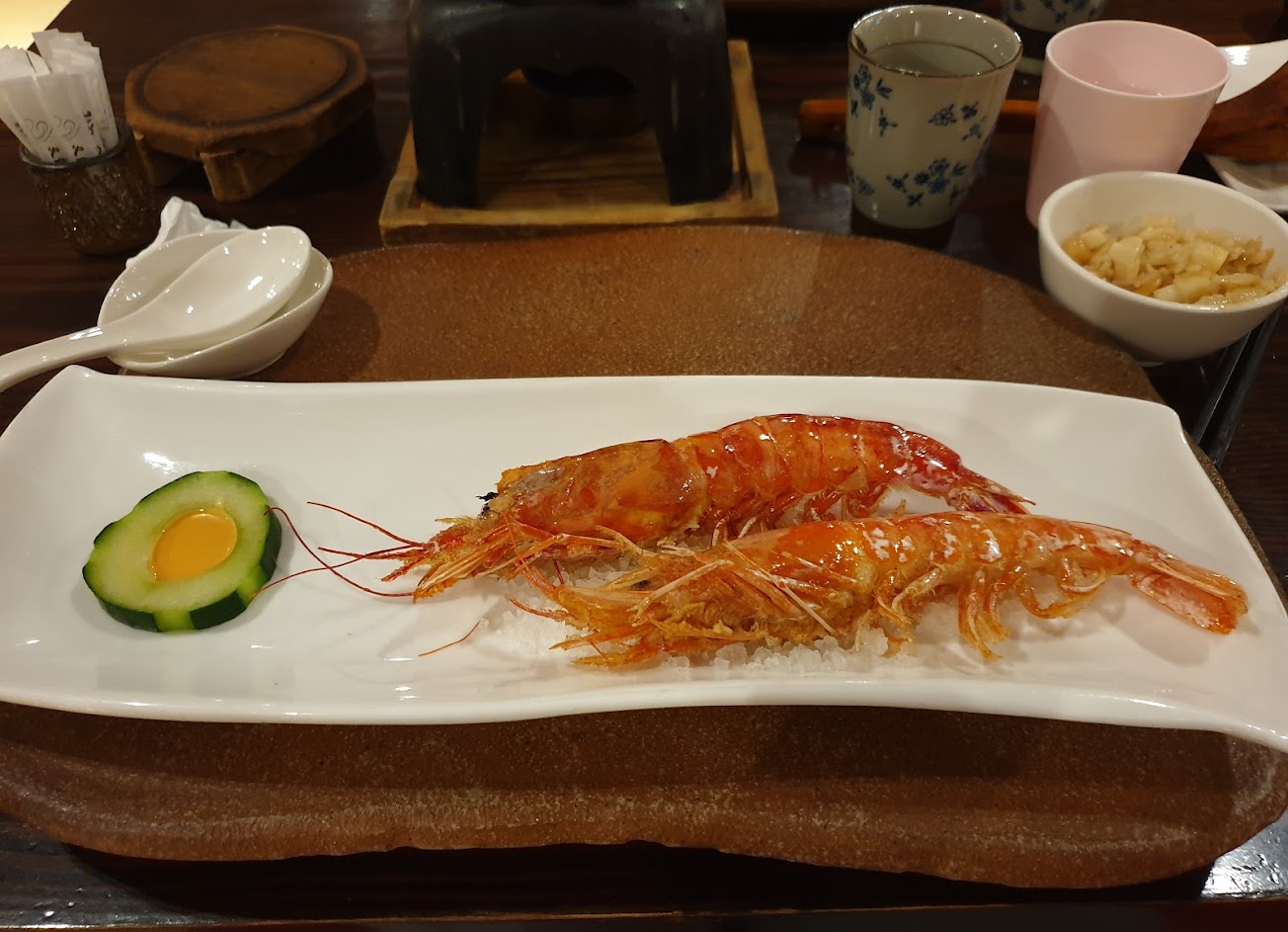 本以為真是小鳥胃的套餐,但整套吃下來也有七分飽的感覺,套餐裡最好吃的還是炊飯,煮十分鐘、悶二十分鐘,有魚有蝦有伊比利豬也有一小片烏魚子、還有花膠響螺湯這也不錯喝?,值得一提的是天使紅蝦真的是超好吃,烤的多汁有熟且不老。