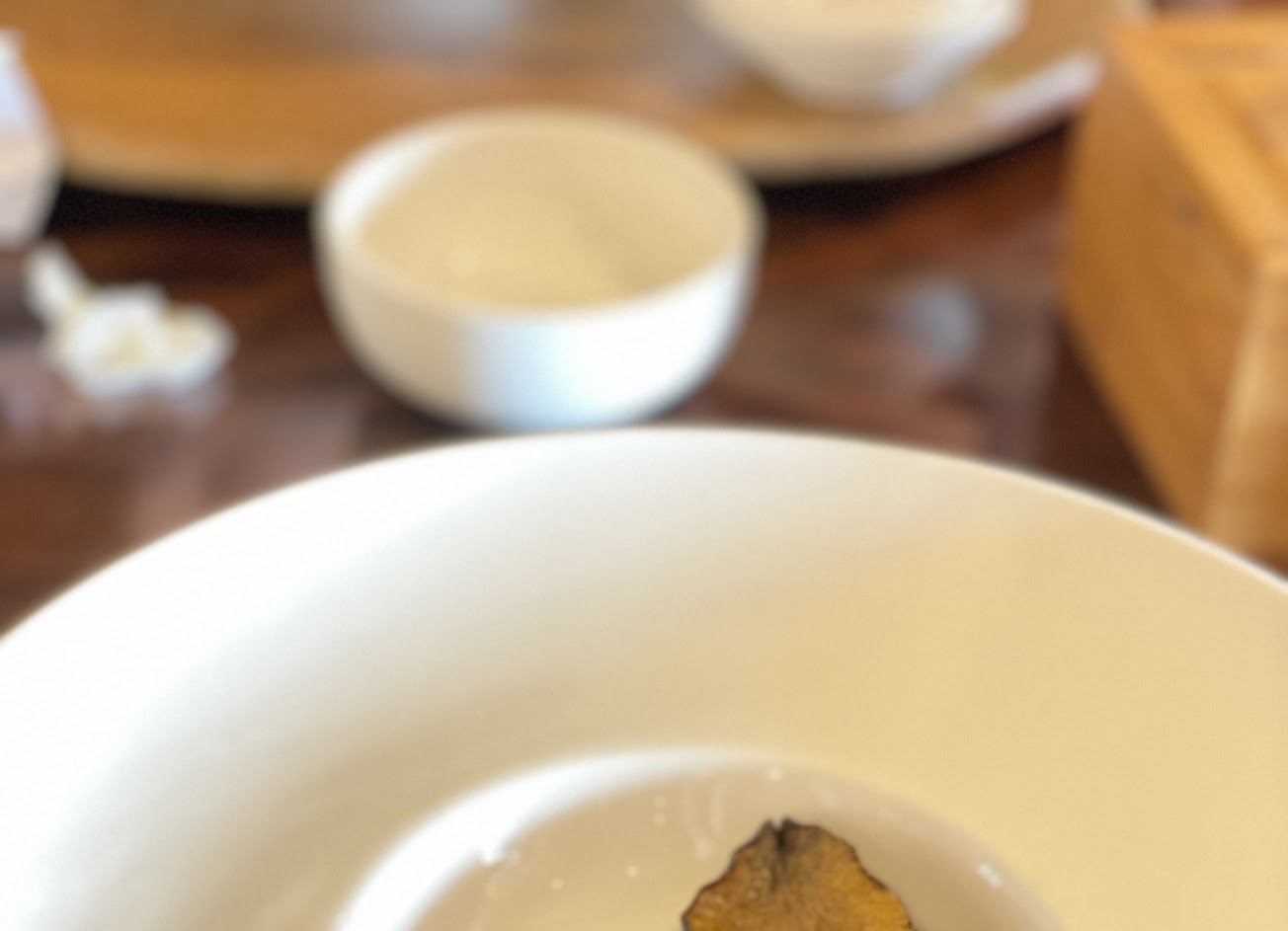 第二道 鮮菇龍膽石斑魚湯,魚骨高湯一點點薑絲,魚皮超Q,肉質軟Q紮實,滿滿膠原蛋白,尾韻都還是香氣。
