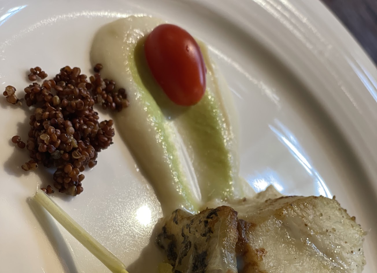 第四道 煎龍膽石斑佐洋蔥青豆泥,可比高級馬鈴薯肉泥,超級香的泥搭配煎香的魚,十分完美!