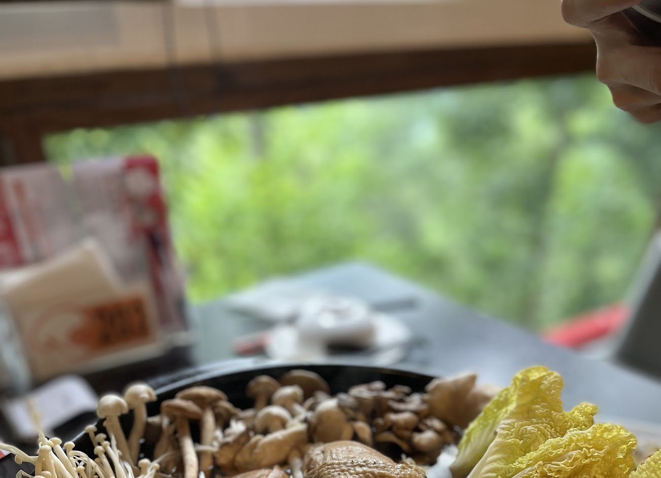 原木家傳鍋,超多種菇類,選用種在栗子樹幹上的香菇搭配數種乾燥菇類熬煮而成,香氣醇厚濃郁。火鍋一上桌就聞到菇香,開始加熱後濃濃香味的飄出來,熬煮的湯色金黃清香。