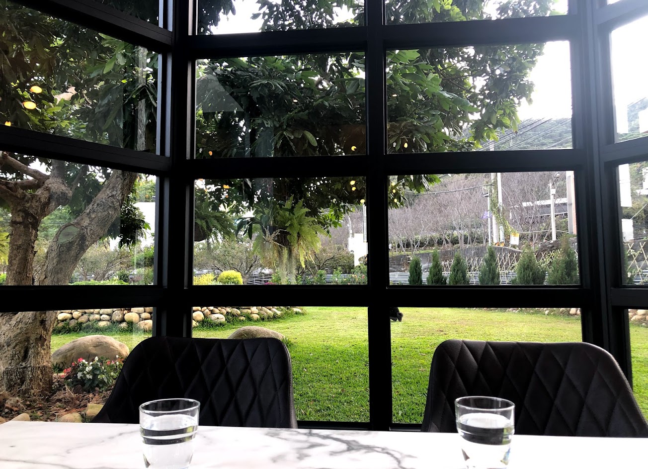 偌大的鋁門窗、可以一眼望去就是戶外的綠意盎然、窗門几淨、眼睛很舒服、餐點還好、是三五好友相約喝咖啡的好地方