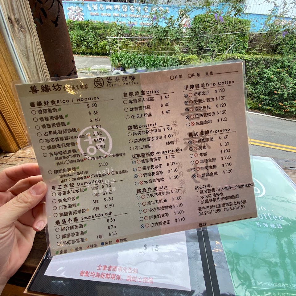因緣際會下,經過這間善緣坊,被這美麗的植物吸引進來,氣氛清淨悠閒,音樂也很古典,窗邊陽光非常舒服,可能是平日來,覺得好悠哉,網路評價油飯非常好吃, 果不其然嚐起來口感味道,算素食界的油飯,數一數二好吃,個人認為比台中冊子油飯好吃,油飯裡的茶葉蛋非常入味,讚?值得一嚐,另外點了古早味乾拌麵,用料豐富麵很Q,個人喜歡重口味,所以一下子就被我的吃到碗底朝天,藥膳香菇湯,湯很濃郁香甜,其中一種食材,吃起來像香菇製做,有點嚼勁,不錯吃? !黃金煎餃,一口一個,滿滿香菇餡料,沾醬蠻特別不會死鹹,蠻建議點來品嚐。最後點了杯哥倫比亞的淺焙手沖咖啡,果然專業級大師,手沖技術熟練,能沖出咖啡豆的香氣跟口感,飯後來杯咖啡,享受午後時光,十分愜意! 另外店外面是玉山香菇,價格比起附近的香菇,都還便宜,很值得購買。