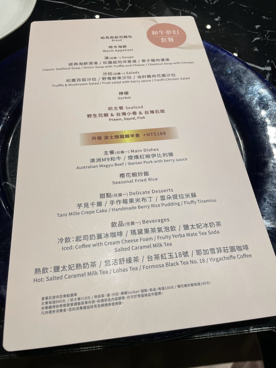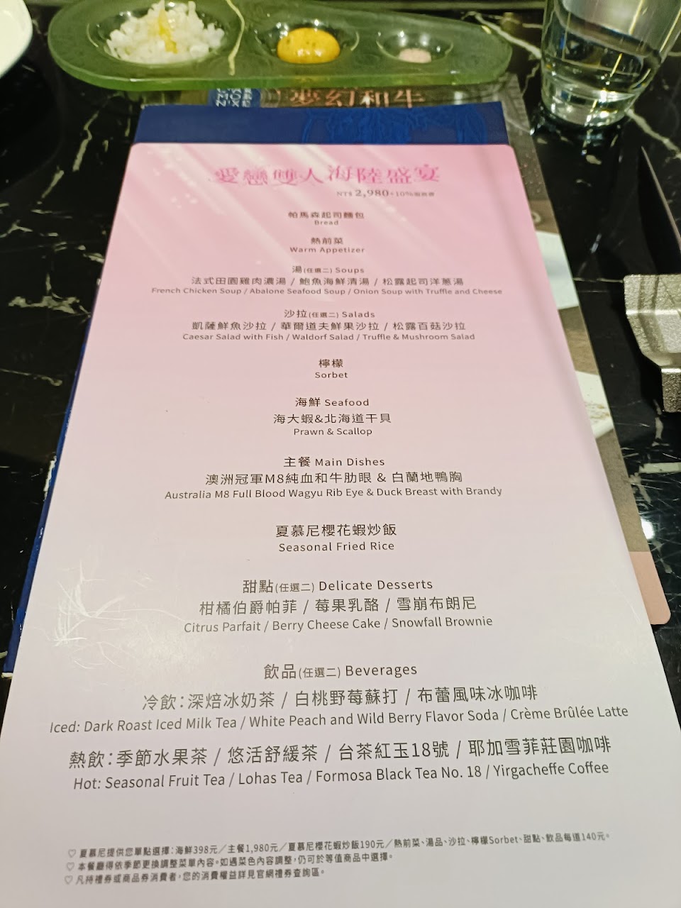 訂位如同諸多評論所述非常難訂位,我們最後訂到的時間是5/19晚上7:50,用餐當天我們提早了五分鐘到場,餐廳非常準時19:50帶位入場,到位置以後我先去廁所,五分鐘後回到座位上開始看菜單,因為以前有吃過和牛套餐,想開Google map 看以前的評論回想口感,決定這次要點的餐點,結果發現餐廳位處地下一樓收訊不佳,所以向後方的服務人員詢問wifi密碼,看完以前的評論不到五秒鐘,八點整一直站在我們座位後方的服務人員就直接強行走到我們兩個中間詢問今天要吃什麼餐點,從一開始點餐的體驗就非常不好,菜單我也才看五分鐘而已,到底是有多急要逼消費者趕快點,中間也沒有人跟我們做餐點介紹,最後我們決定點海陸和和牛套餐。