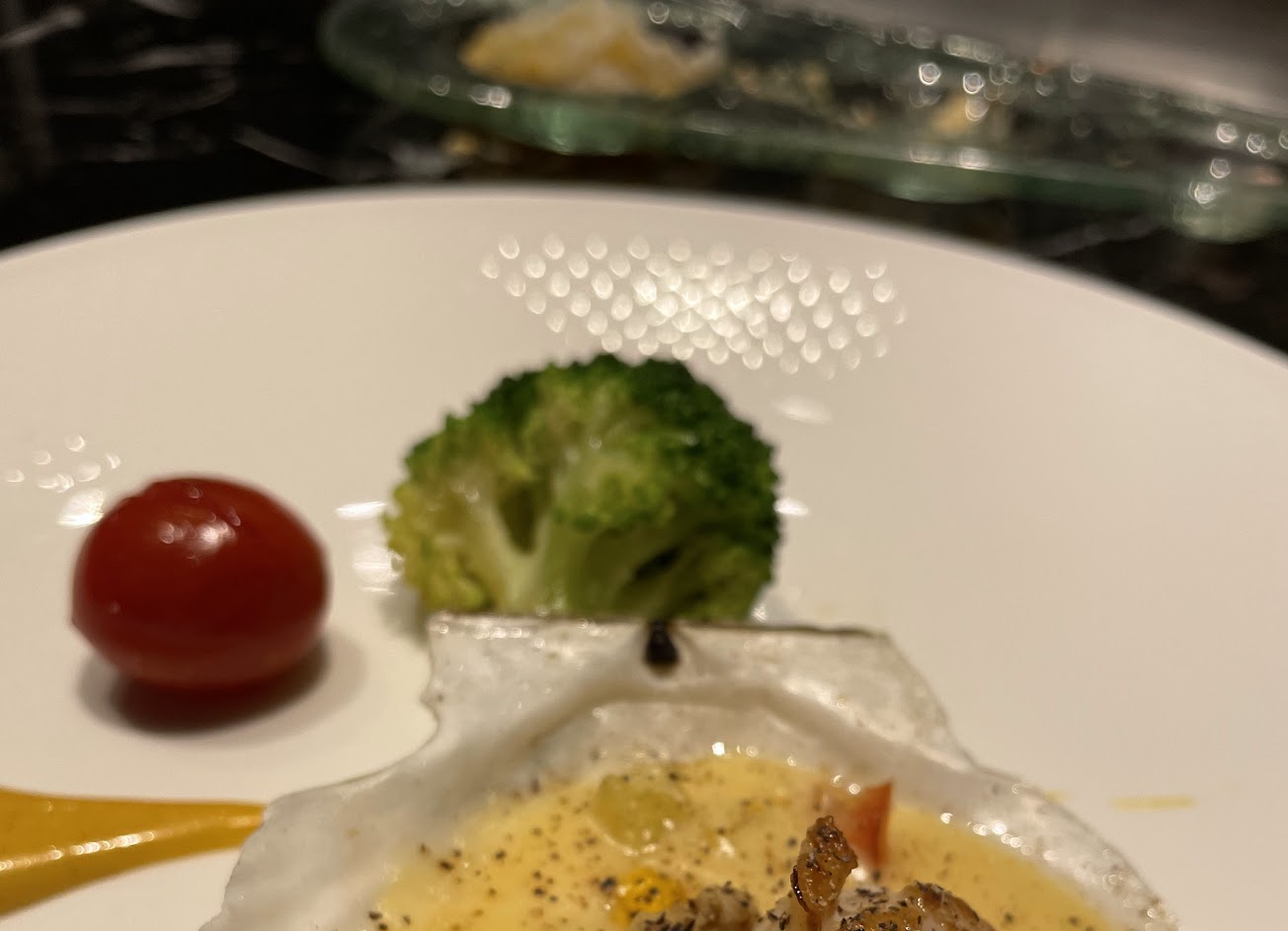 今天熱前菜時令海鮮是肝醬泡芙、松露蒸蛋、哈密瓜球生火腿。