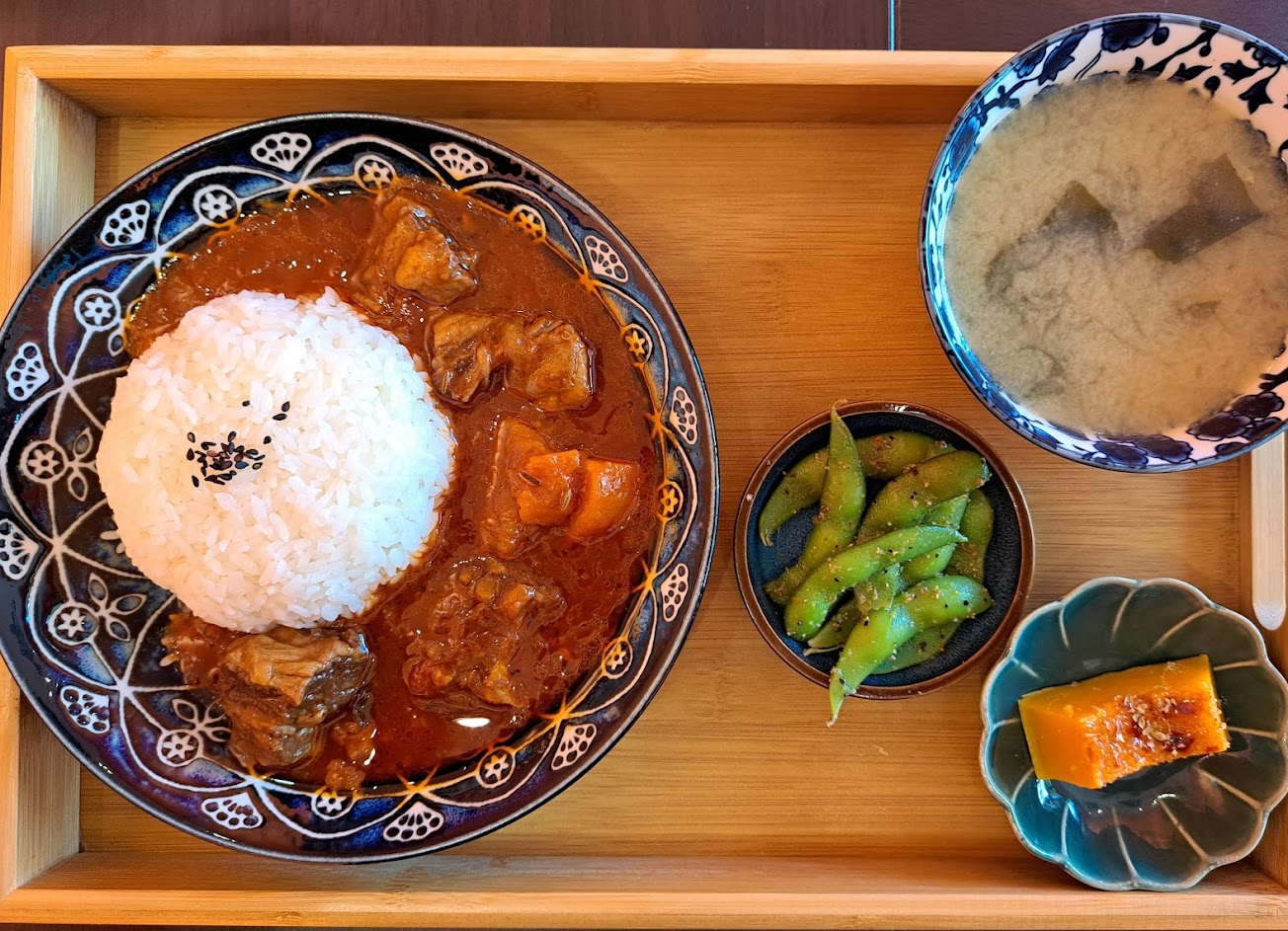 咖喱飯價位160,有點偏高,但嚐一口醬就知道為什麼老闆把價位設定這麼高了。咖喱醬很稠,吃起來有股繽紛的香料味,醬汁份量看起來偏少,飯量正常,但吃完還會剩下三四匙的醬料,儘管很下飯,也不會感到過鹹過膩。 但也許是濃郁的關係,用餐過程會覺得有點乾,小菜有兩樣,分別是一小條南瓜與毛豆點綴,都不是具有水分的配角,反倒是在評論區照片中有看到別人用餐有洋蔥,有點失望我這次用餐沒有這項配料,不然我想是很適當的搭配。我也想建議菜單能有多加滑蛋的選擇,讓口感多有一層變化,也不會整份餐點偏乾。