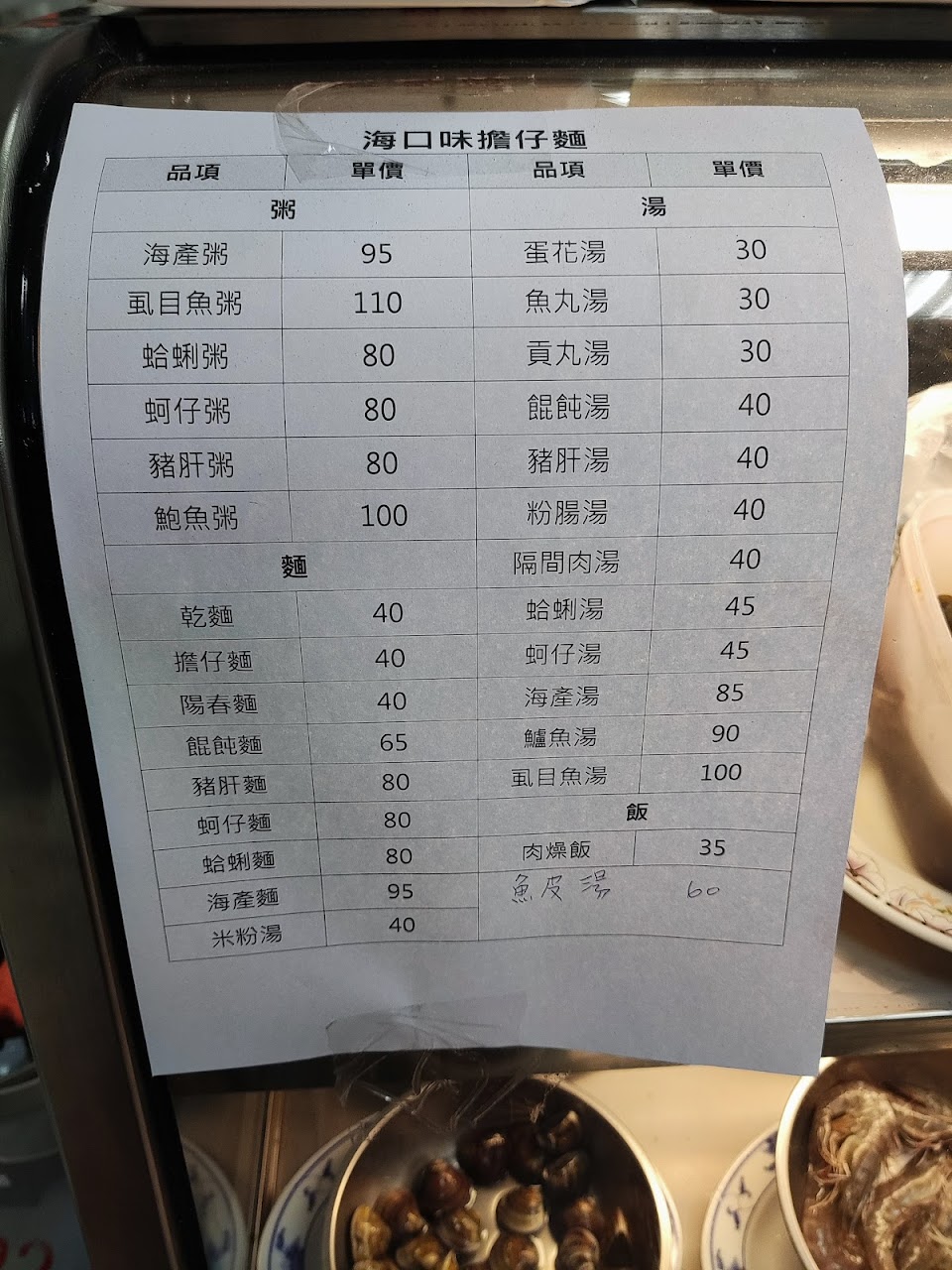 海產粥100元是泡飯的感覺,料多,擔仔麵40元做成湯的,麵體是油麵,口味是南部口味