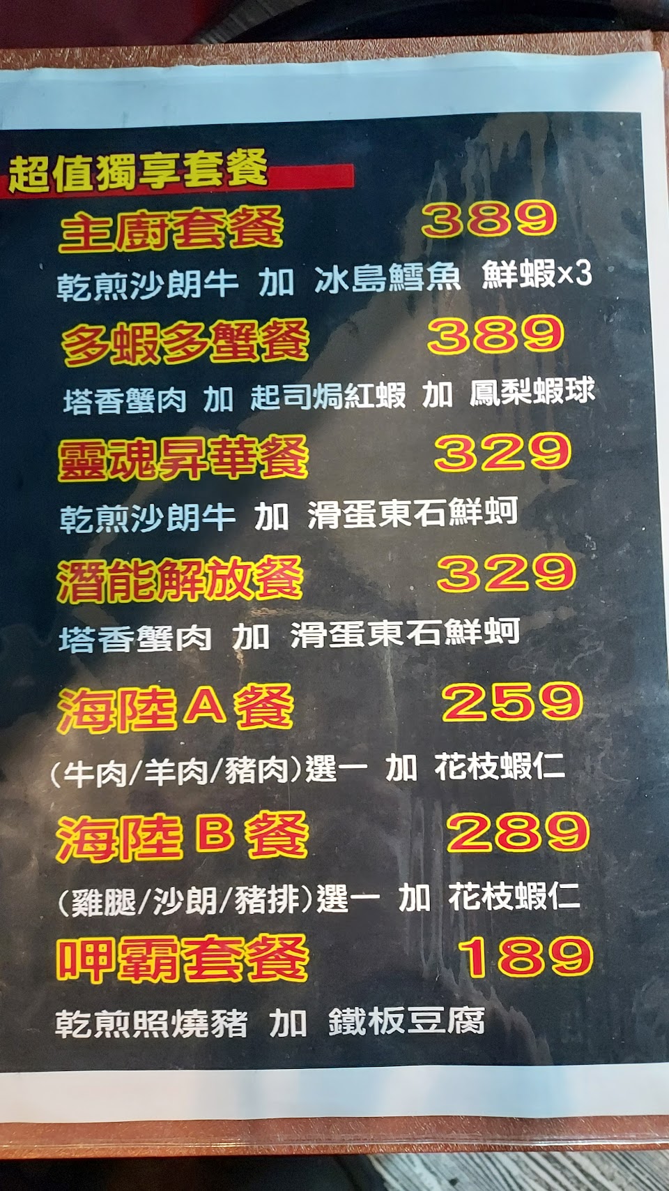外帶(A套餐牛肉+花枝蝦仁)+牛肉餐,看老闆一個人炒的很急(感覺就是很奢草(台語)的感覺),看著看著心裡想著完蛋了…回家感覺吃了會覺得很雷,回家吃了之後,牛肉、蝦仁、花枝、豆芽菜、高麗菜(最主要的主菜及配菜都炒的都是焦味,覺得很慘),只有鱈魚、蔥蛋可以吃,湯(感覺裡面有混著茶味很可怕),下次不敢再來吃了….好可怕~___~