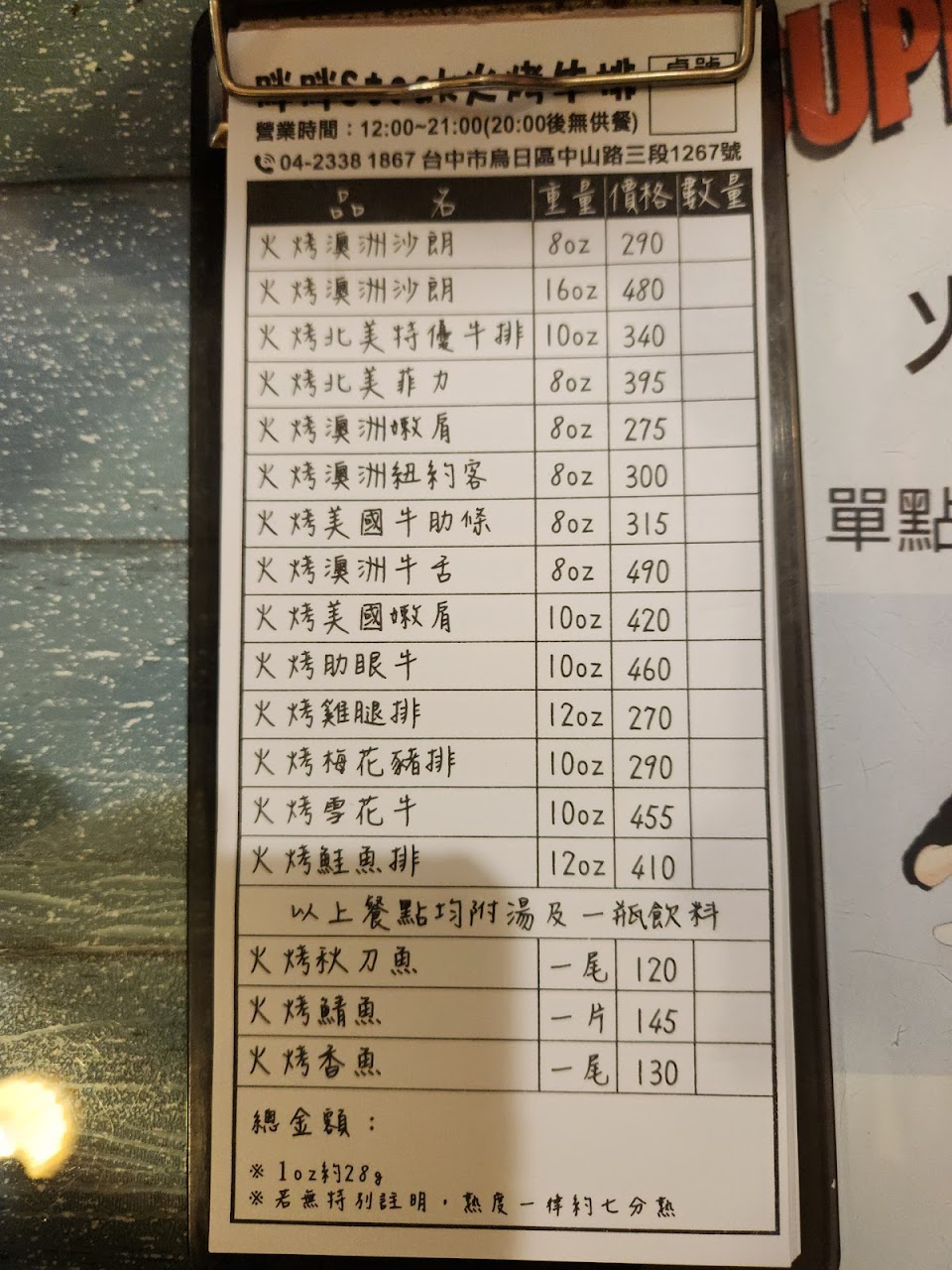老闆親切,解說詳細,雖然座位不多,但餐點都很實在,點了兩客牛排及一客豬排四個人一起吃,份量剛剛好 1.胖招牌:肉質軟嫩 2.菲力:約三分熟,血水較多,會怕生的可以請老闆烤熟一點唷!老闆還幫我們剖半烤,真的很貼心 3.豬排:厚實的口感 4.火烤秋刀魚:覺得比較普通,肉不多,下次不會點 5.火烤鯖魚:配上獨特芥末胡椒鹽,讓鯖魚表現比其他店家更出色
