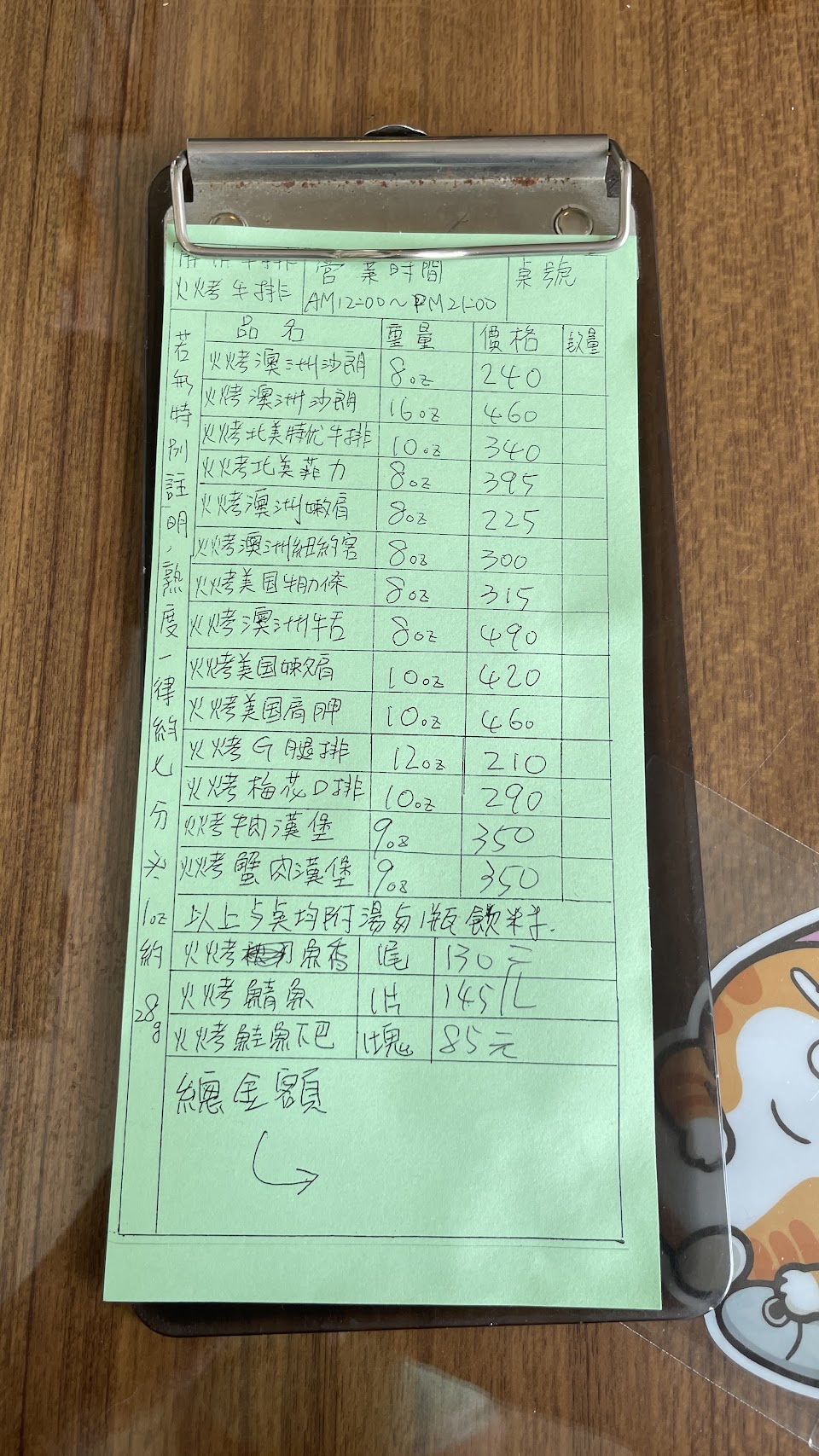 建議前一天先電話預約,確認老闆有開店,方便的話再告知自己想點的餐,免得到店時想吃的牛排已經賣完了(戰斧牛、羊排等需事先告知,方便老闆備料)