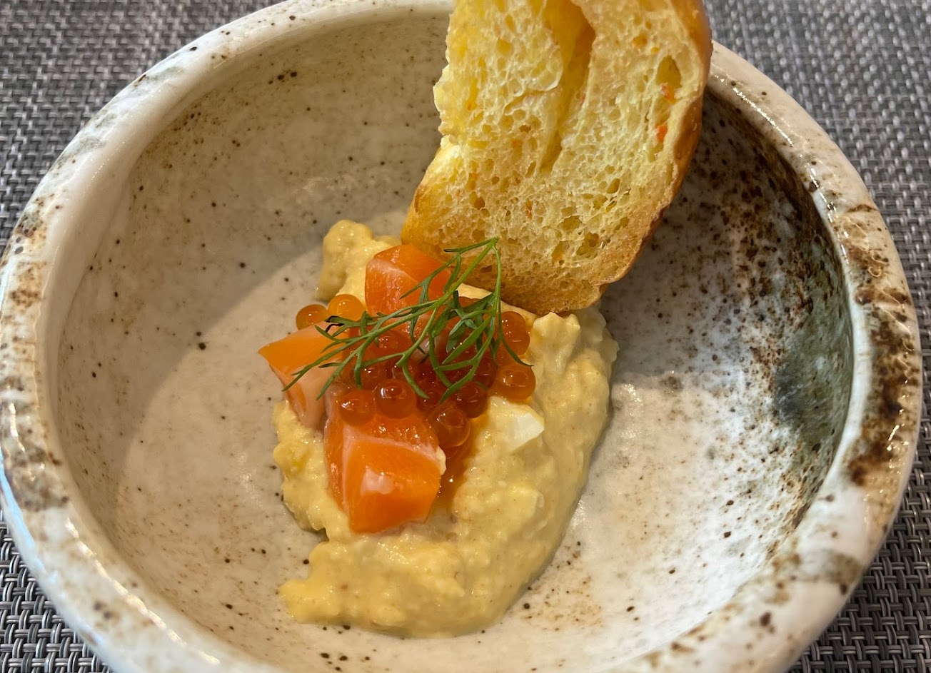第一道:煙燻鮭魚搭配奶油青蘋果魚子醬(開胃小點)