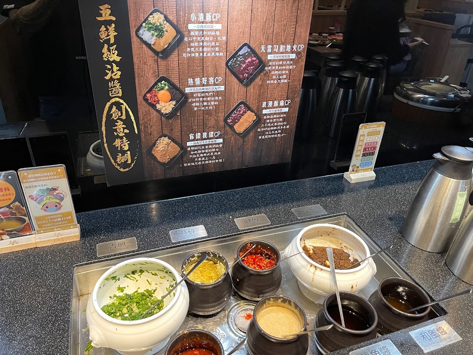 麻辣跟番茄的湯頭還不錯,自助調料區也很豐富,但火鍋內配菜量偏少、對比價格稍貴,整體性價比來說就見仁見智了。