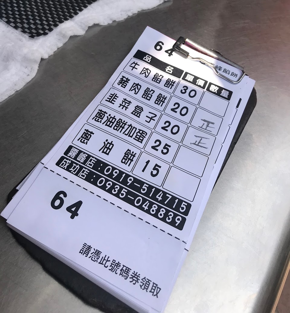 點餐直接劃單後撕下號碼條,有2本依序做,但叫號不見得會依序給,主要還是看什麼東西先做好,在單子上有點的會先給。 豬肉餡餅內有湯汁,味道挺不錯的,蔥油餅加蛋好像忘記刷醬,味道就淡了點,也還不錯吃,只是人真的很多。