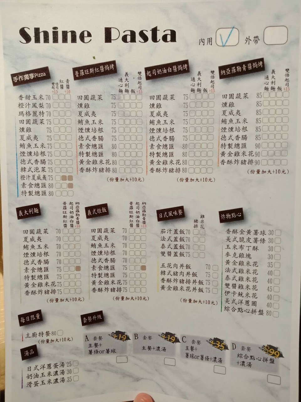 份量中等,偏好披薩,能夠吃飽並且沒踩雷過,算是安全牌。因為點過少數幾次義大利麵,就吃到兩次沒熟的豬排……之後都不太敢點義大利麵(份量也偏少)