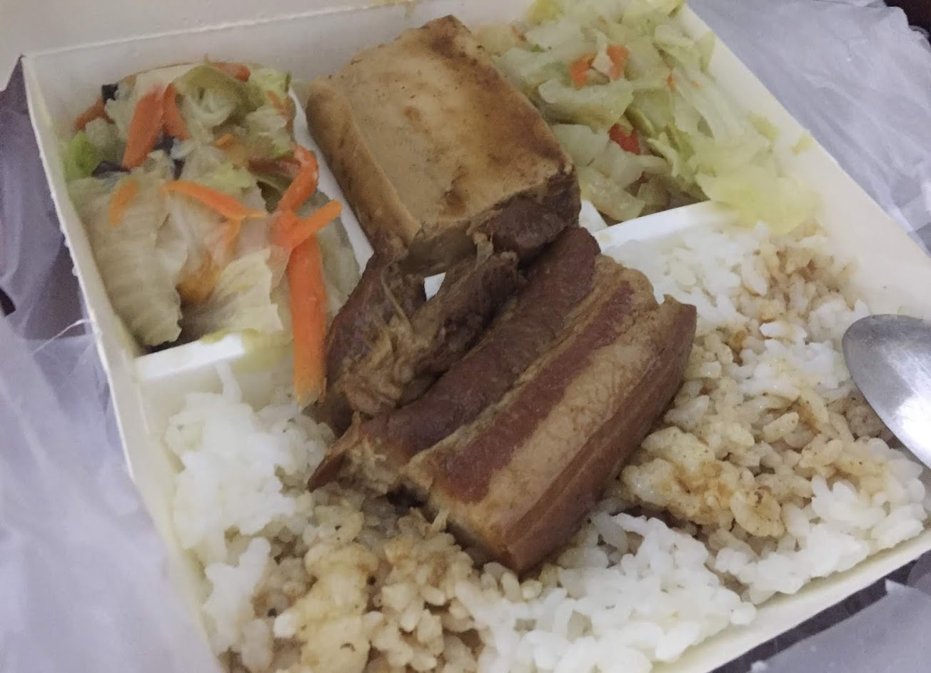 吃不下便當 我兒子最喜歡滷排骨飯 跟便當的差別是少2~3道的配菜 不吃肉看了就忘 晚上九點兒子還要加個飯 還是他們家的滷排骨飯 或 炸排骨飯 老闆娘人很好 動作也快 現在門口貼固定星期六日休