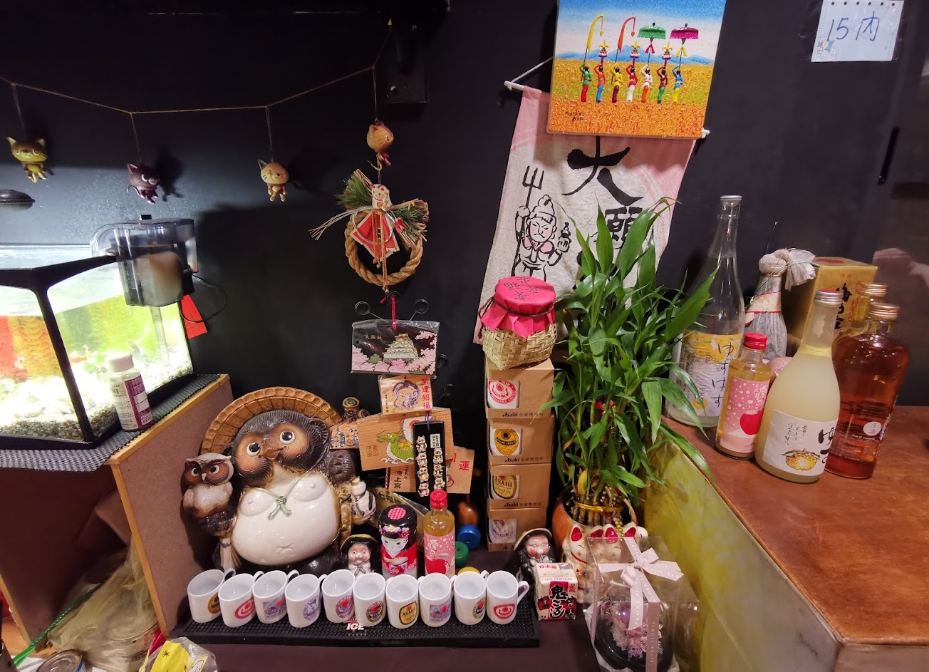一進門很像來到日本社區的小店,小小的空間裡都是有些時光的裝飾,玩偶、公仔、酒就只差在牆面上寫上生啤100。