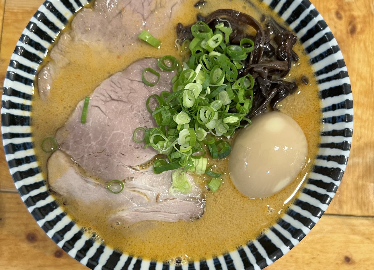 非常好吃的一間拉麵店,湯頭濃郁得恰到好處,不會膩更不會死鹹,兩片香噴噴的大肉片令人垂涎,麵條吸汁飽滿又有口感,木耳和蔥花是點睛之筆,爽口而不失單調,另外還有一整顆咬下會使人驚艷的溫泉蛋,十分美味!