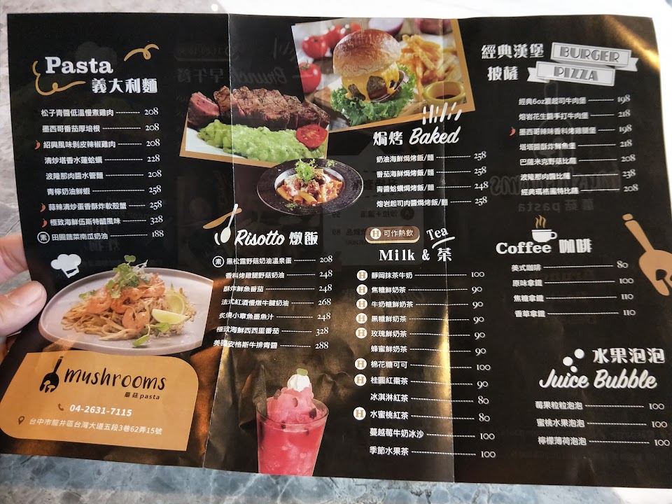 位於東海黑肉圓巷子裡的蘑菇,每到用餐時間就是高朋滿座~價格實惠出餐也頗快速;外頭綠色植栽綠意盎然,裡頭還有各式主題拍照區,品嚐美食與拍照一次滿足! – ?極致海鮮伍斯特醋風味義大利麵 $328 ?美國安格斯牛排青醬燉飯 $288 ?法式紅酒慢燉牛腱奶油燉飯 $268 ?蒜辣清炒蛋香酥炸軟殼蟹義大利麵 $258 ?經典6oz濃起司牛肉堡 $198 ?芒果優格舒芙蕾 (季節限定)$198 ?黑糖珍珠奶茶舒芙蕾 $168 ?爆爆爆米花舒芙蕾 $158 ?酥炸海鮮拼盤 $168 ?濃起司薯條 $109 ?吮指水牛城辣雞翅 $99 ?莓果粒粒泡泡 $100 ?蔓越梅牛奶冰沙 $100 ?玫瑰鮮奶茶 $90 凡加套餐飲品折抵20 – 牛肉燉飯系列及軟殼蟹義大利麵是蘑菇必點的菜色,紅酒牛肉燉到軟嫩入味,是安迪的最愛,較喜歡有嚼勁則推薦長青的牛排青醬燉飯~米粒粒粒分明不軟爛!螃蟹不管怎麼處理都是我的心頭好,酥軟入味的軟殼蟹搭配蛋香十足的義大利麵讓人一口接一口,而炒的香辣夠味涮嘴的海鮮義大利麵有各式新鮮海鮮!手打漢堡肉讓許多外國客人一吃成主顧,分量頗多的酥炸海鮮拼盤和薯條炸的香酥好吃讓人回味。 – 芒果舒芙蕾使用優格醬調配,鮮甜的芒果搭配酸v的優格清爽開胃,珍珠奶茶黑糖香醇珍珠Q彈,沾著一旁滑順鮮奶油超罪惡XD舒芙蕾搭配酥脆爆米花口感頗有層次甜度適中,是友人的第一名,建議不要放太久唷,避免爆米花軟掉~舒芙蕾沒有令人害怕的蛋味,彈性處理的恰到好處,飲料我喜歡稍有甜度的莓果粒粒泡泡,甜度最低的是玫瑰鮮奶茶~