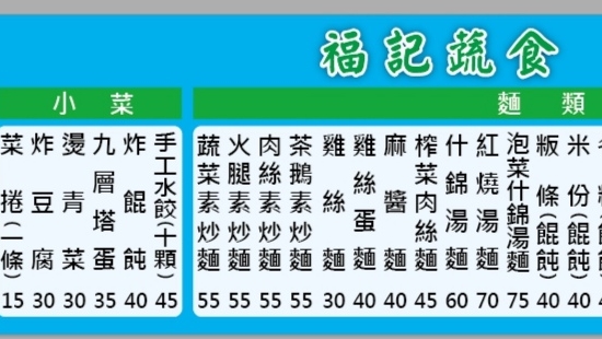 另店門口左側為素食小吃(菜單如附),感恩,造福。上面廣告為前身福記快炒