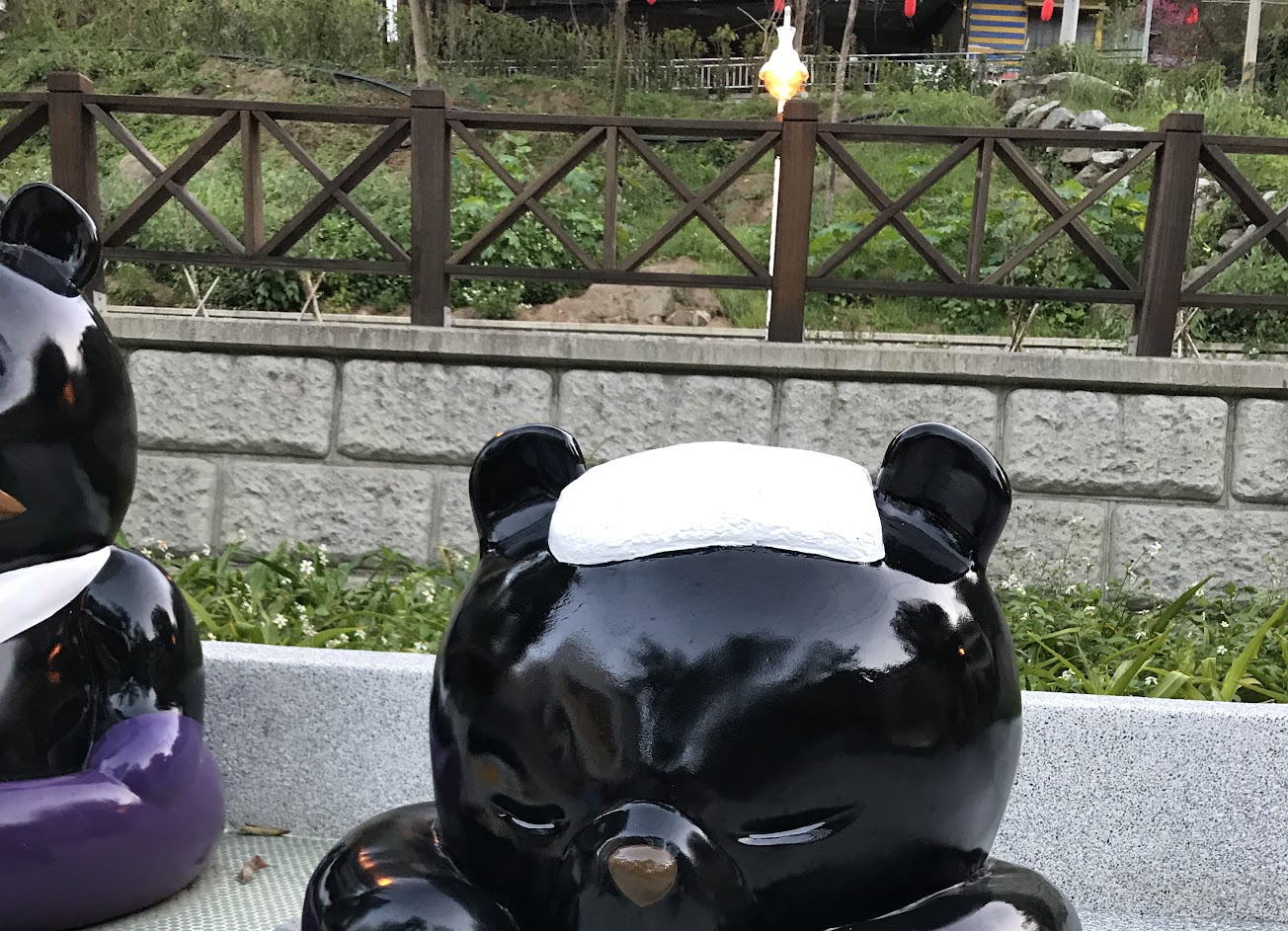 七隻黑熊雕塑,意涵幸福泡湯熊(Happy Bathing Bear),代表谷關地區的七雄(“雄”與”熊”音同 )山名,七隻黑熊七種不同的色彩,象徵七彩繽紛,熱情有加,感受享受溫泉的溫度,帶給浴於其中的樂趣.