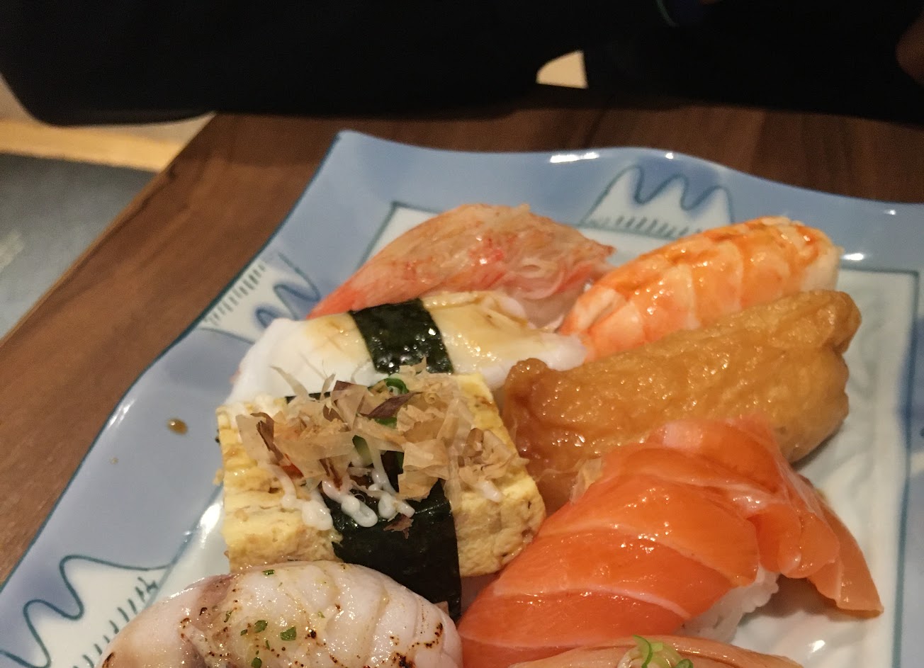 算是很大的壽司 大約爭鮮的1.5倍 可以一口塞但沒辦法好好咀嚼要吞口茶的大小 牛肉很軟 剛剛好的熟度 鰻魚油脂剛剛好 好吃 很下飯 比目魚壽司散掉了 不常吃這個本來就會這樣嗎 鮭魚滿紮實的 吃到有點飽 下次吃再說感想 鮭魚卵也很好吃 但是真的太飽了? 真的不應該把最喜歡的留到最後吃