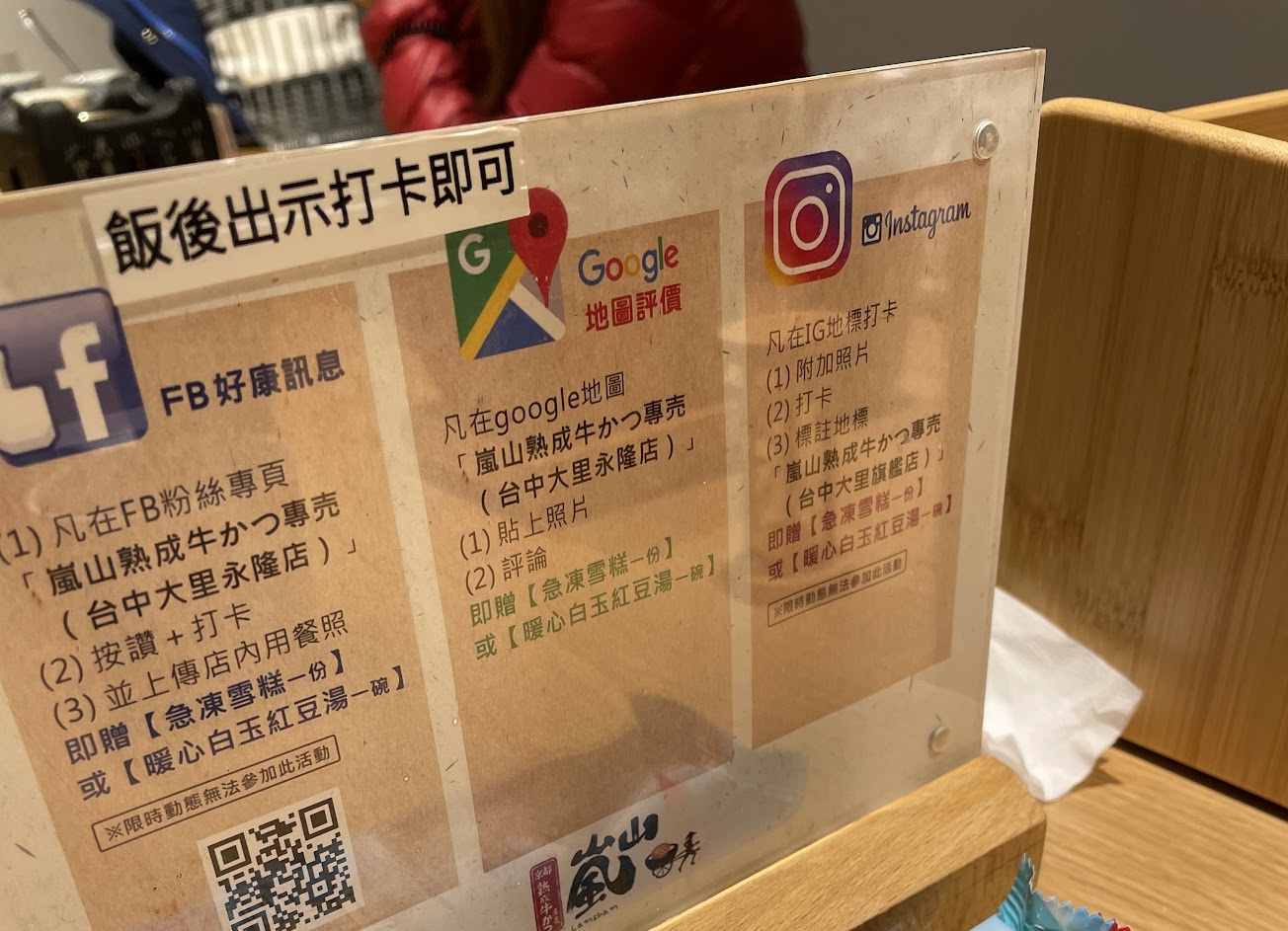 以下自費心得,請安心服用 嵐山熟成炸牛排在台中有很多家分店 餐廳的裝潢布置的真的好漂亮,裡頭還有櫻花樹可以拍照 疫情期間活動蠻多,自取外帶都有優惠。 炸牛排沾山葵、海鹽、七味唐辛子、薄鹽醬油、日式溫泉蛋、日式蘋果咖哩都OK。 除了炸牛排也有戰斧豬、唐揚雞,選擇很多呢。