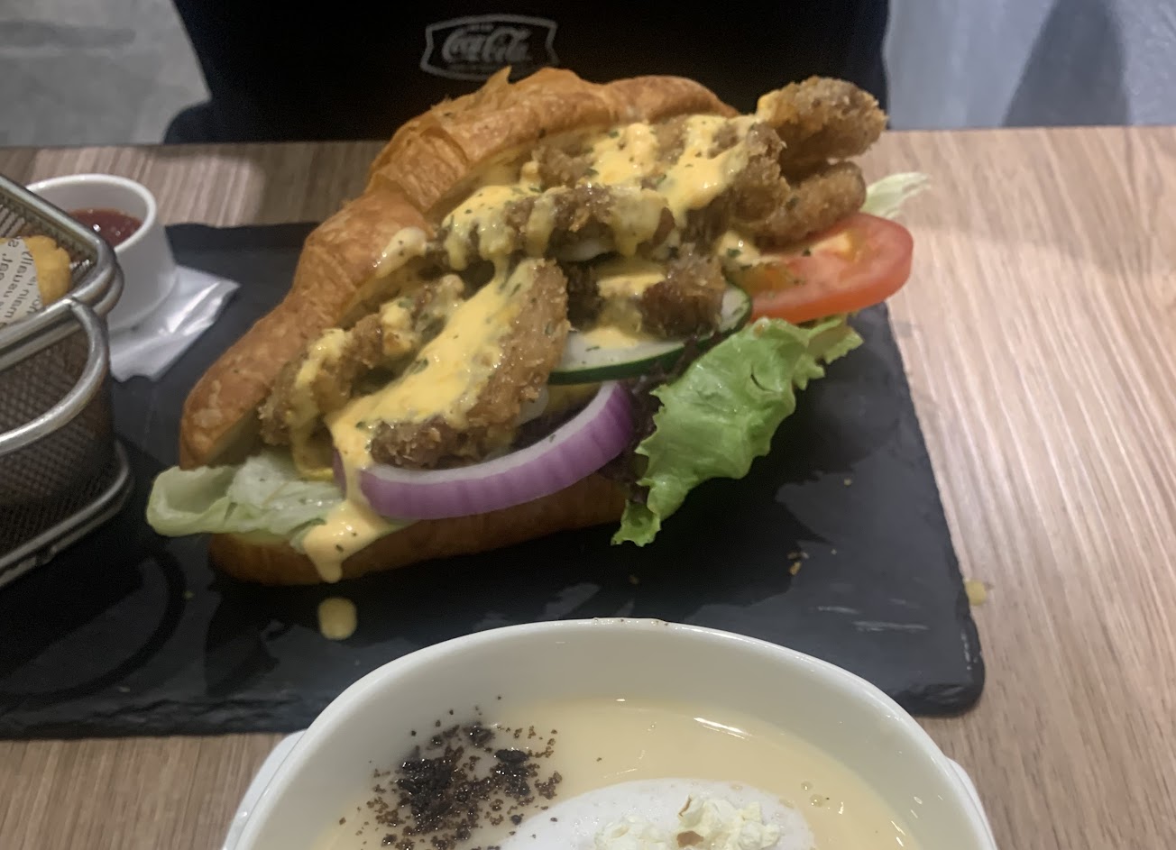 雞腿排很嫩、可頌烤的很酥脆。水果沙拉沒有沙拉裡面是果凍&水果包在果凍裡,有顏值也好吃
