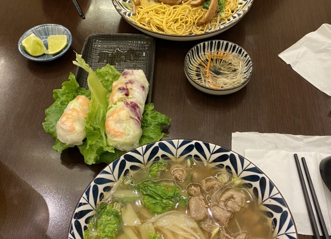 第一次來此店用餐 服務人員態度良好,看到有小小孩會主動詢問是否需要餐椅並協助搬椅子,用餐環境明亮乾淨,醬料區很乾淨,醬料櫃下有餐具、兒童餐碗可自取,但兒童餐具要自帶唷,唯一比較美中不足的是,用完餐後身上會有些許味道,但不影響 餐點方面, 牛肉河粉及烤肉河粉湯頭味道鮮美,可加入檸檬片及辣椒,增加酸辣口感唷,不過,量方面比較適合小胃口的女生或孩子,男生可以考慮點飯類或是單點白飯、米線、河粉、雞蛋麵 法國麵包吃起來比較不一樣,每家的做法都不同,但,很新鮮好吃,麵包現烤,微微酥脆,內餡清淡,不鹹不甜,孩子可吃 大推蝦餅,超好吃,厚實,新鮮,口感佳,搭配沾醬,甜甜辣辣,讓你一片接一片 飲料方面 咖啡喝起來就像市售的越南咖啡,有煉乳的香味及甜味 椰子水喝起來有嬤嬤渣渣的味道,香香的,還吃得到椰肉,可以試試看 整體來說,很推薦大家能來吃吃看,很不錯的餐廳,不過最好要避開用餐時間或是提早來,不然生意很好要稍等片刻唷