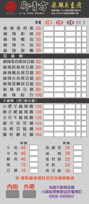 2024最新在地推薦餐廳的菜單_御青方麻辣臭豆腐 太平中山店的菜單、圖片
